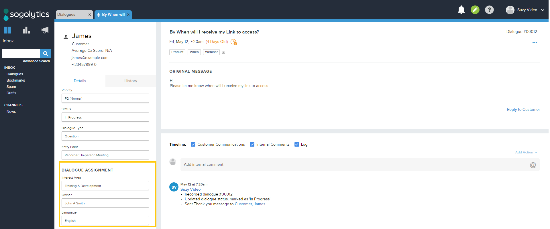 If you decide to change the Interest Area, you will immediately change the Owner to whoever is the Owner for that Interest Area. If you want to see all of the previous changes regarding Dialogue Assignments, you can view those by looking at the Dialogue Timeline down below.
