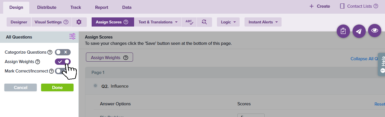 Assessment items can be grouped into multiple categories, allowing you to calculate overall score and scores by category. Adding weights into the equation allows you to assign percentage values to specific questions and categories.