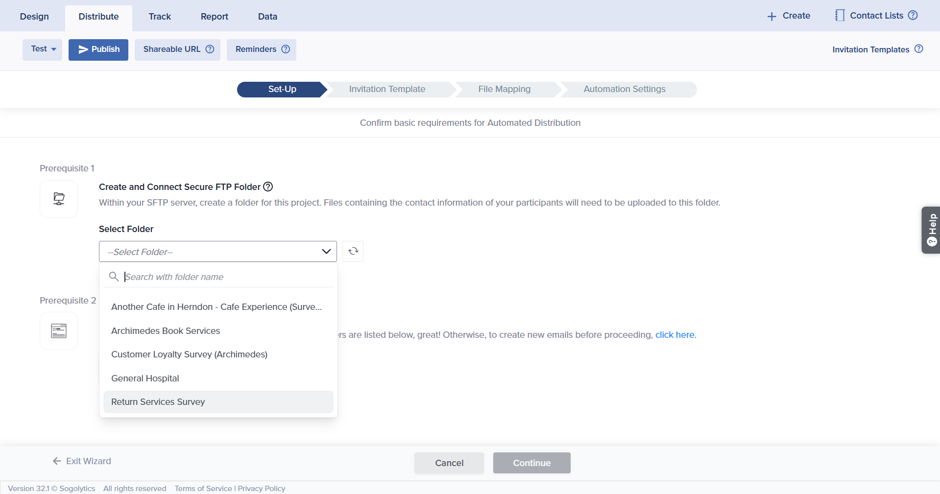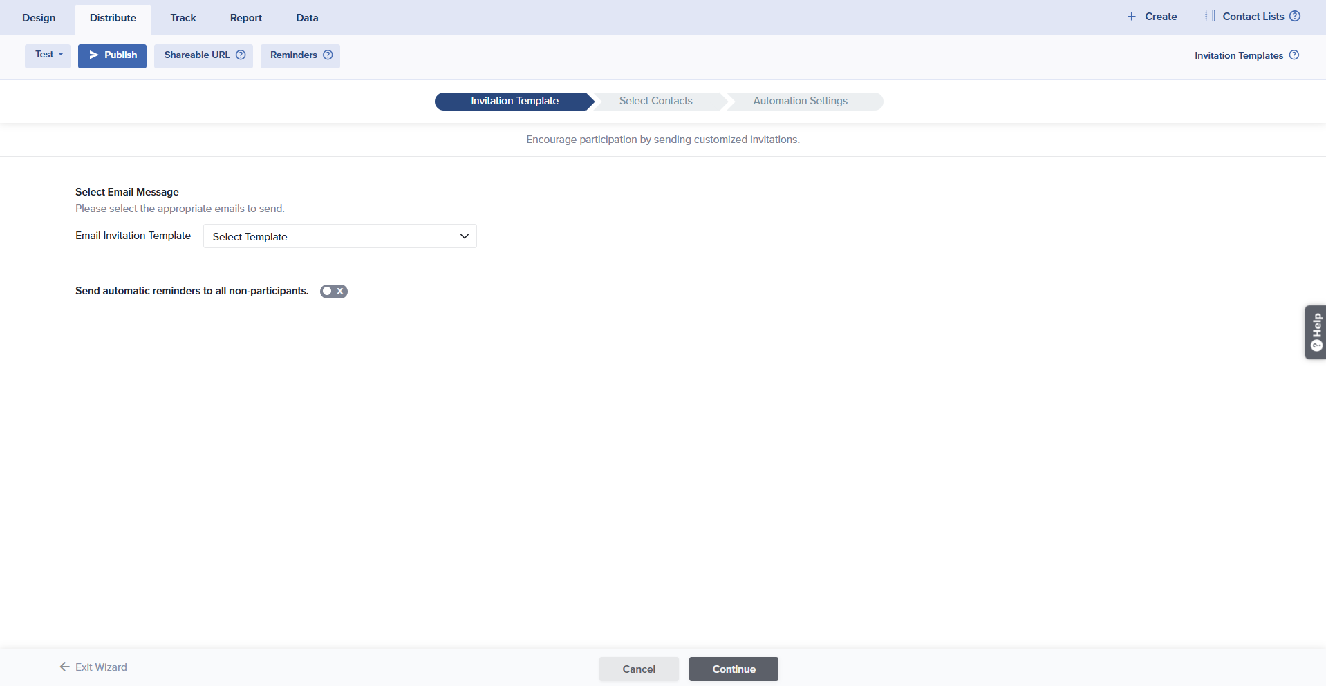 - Select the invitation template you will use for distribution. You can also opt to set up Automatic Reminders. Click Continue.