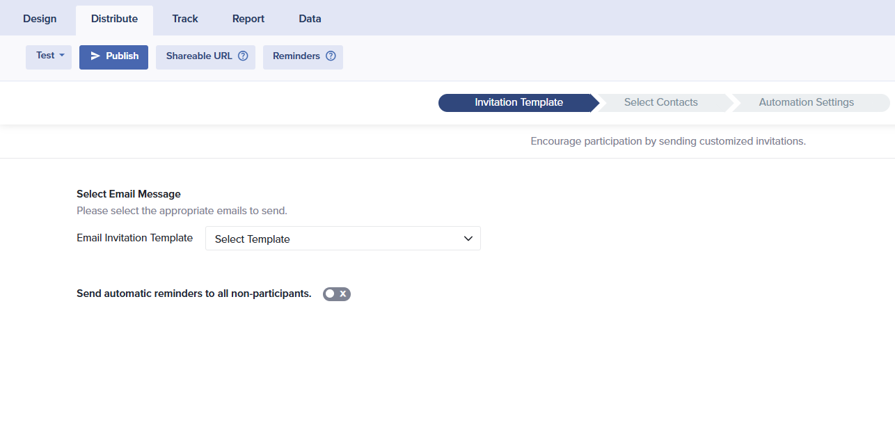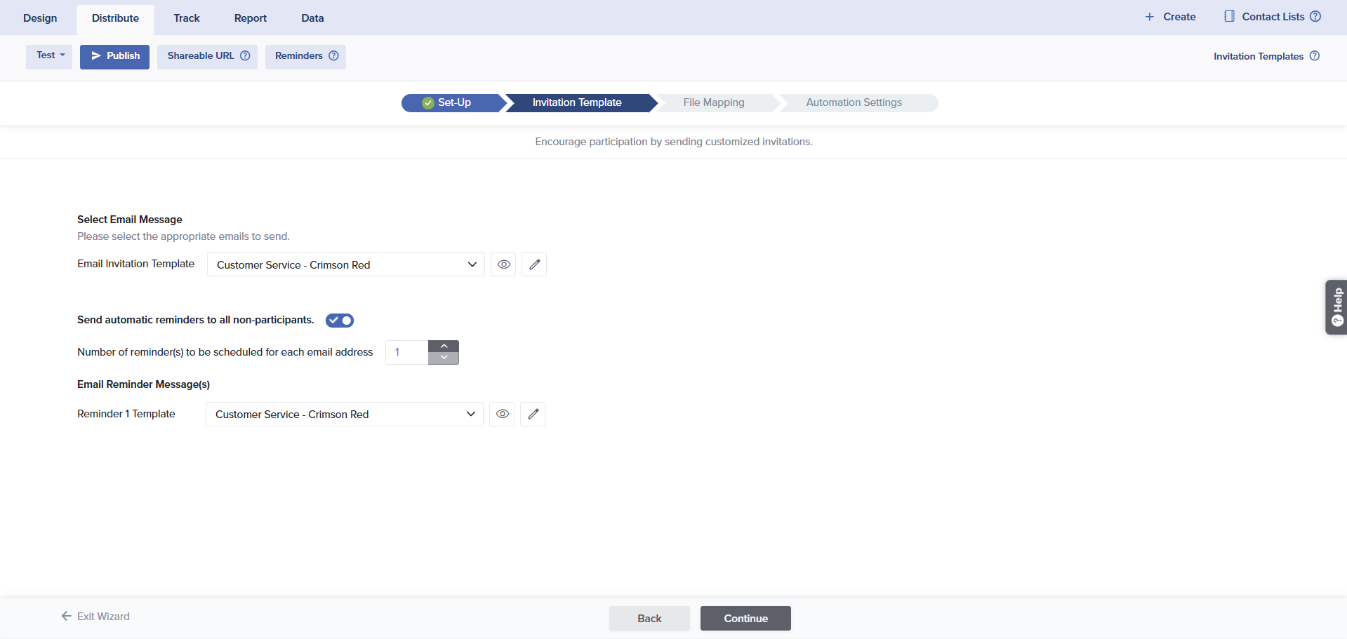- Next, select the Email Invitation Template you will use to distribute your project. You can also choose to set up automatic reminders by toggling on Send automatic reminders to all non-participants. Then, schedule the number of reminders to be sent out and select a template for each reminder. You can use the same template, or a different template each reminder. Click Continue when finished.