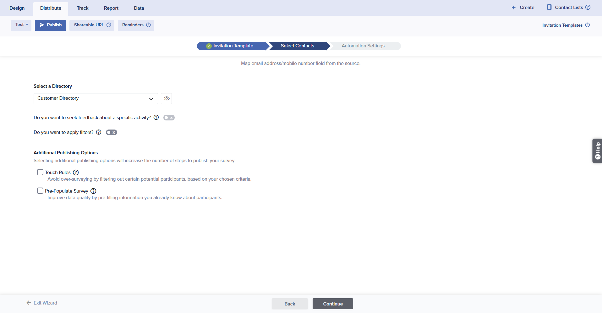 - Select a Directory to distribute your invitations. You can use the additional publishing options to apply Touch Rules or apply Pre-population. If pre-population is already applied to your project, this option will be pre-selected for you. Click Continue.