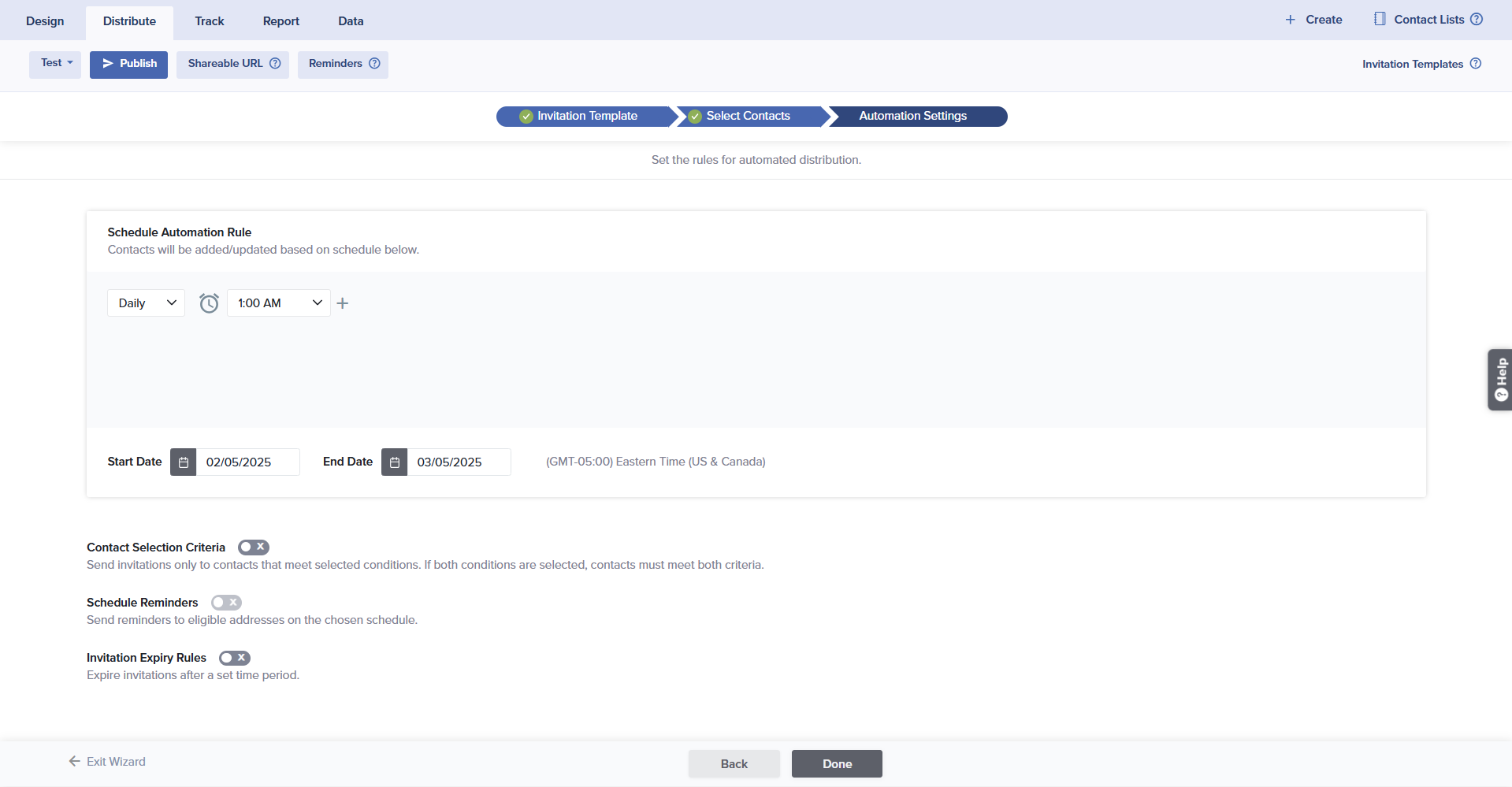 - Use the additional options to configure contact selection criteria, schedule reminders and set invitation expiry rules.