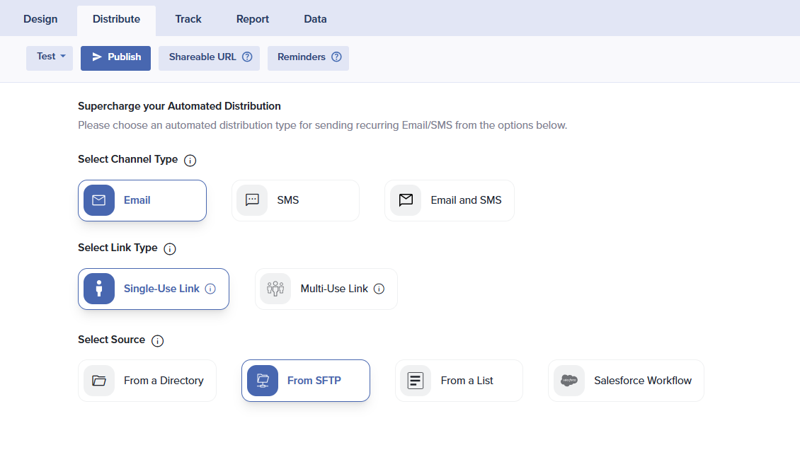 - Select the Channel Type (either Email or Email and SMS) and the Link Type. Select the source of Automated Distribution as From SFTP.