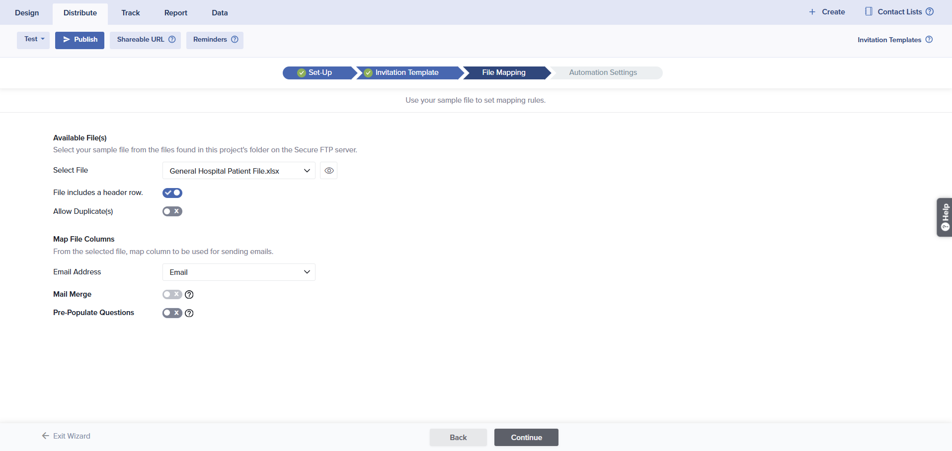 - If you have incorporated Mail Merge into your email invitation or Pre-Population is applied to your project, these options will automatically be toggled on for you and you’ll be able to map this data in another step. Click the links to learn more about these options.