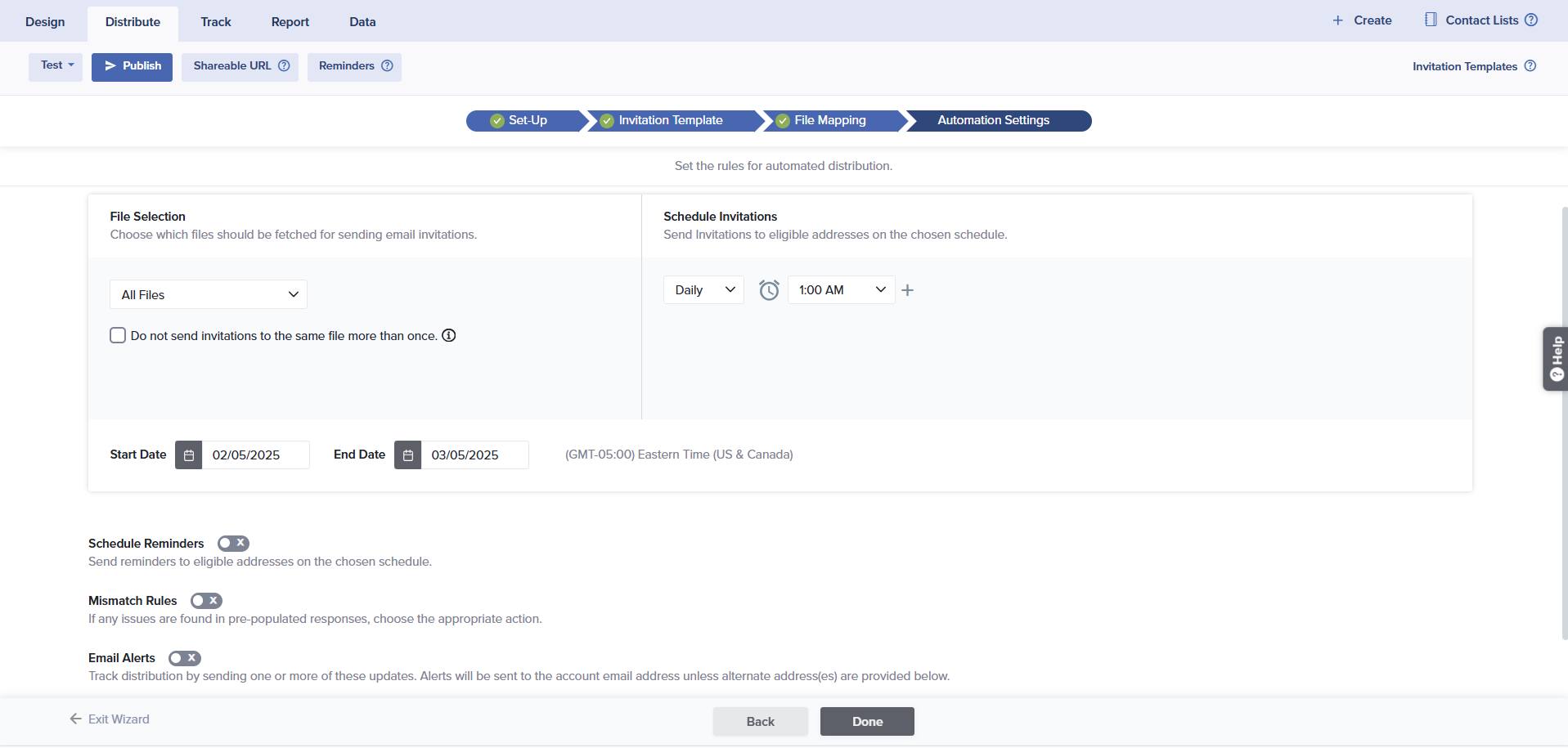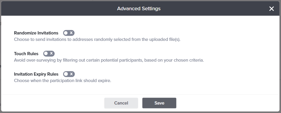 - Use the additional options to schedule reminders, select the appropriate action for mismatch rules, and set email alerts. Advanced settings can be used to randomize invitations, apply Touch Rules and apply participation link expiry rules.