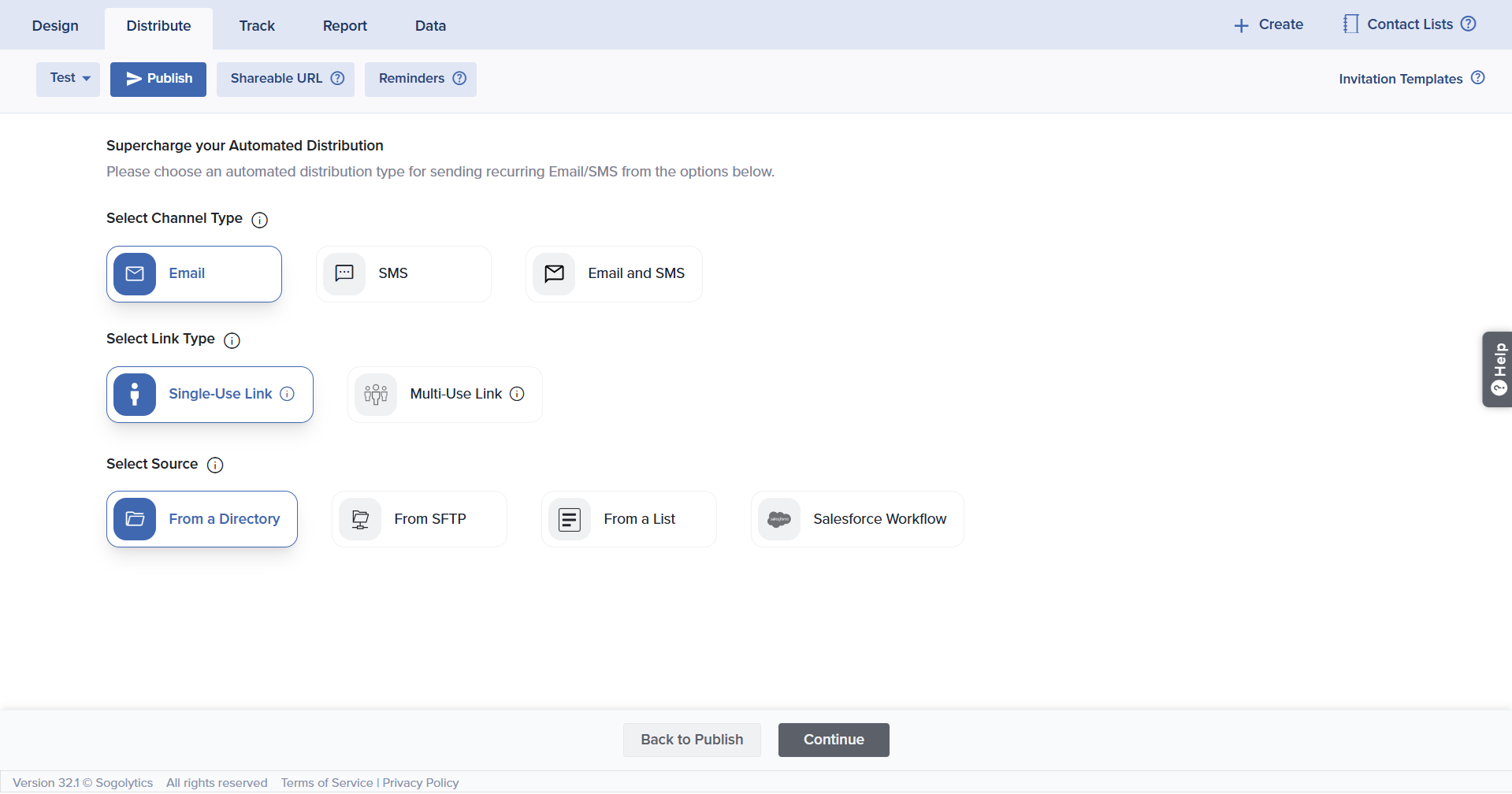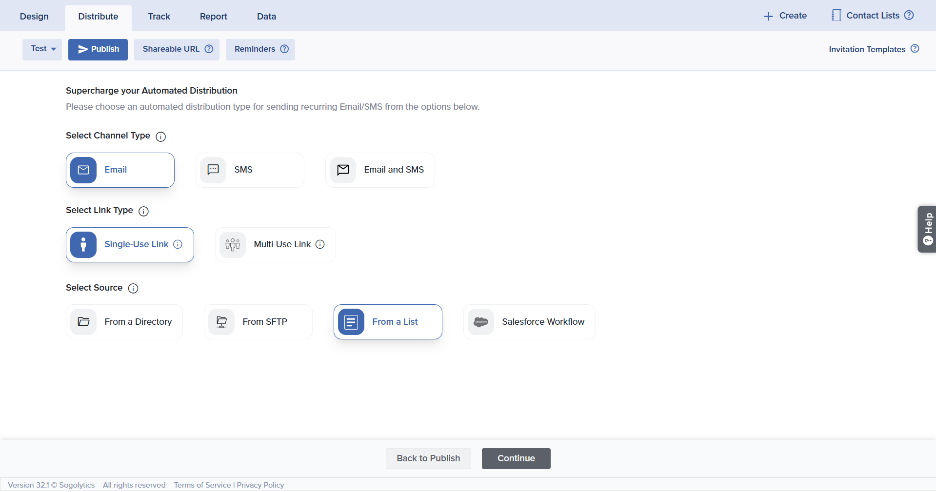 - Select the Email as the channel type, then select Single-Use Link. Select the source of Automated Distribution as Salesforce Workflow.