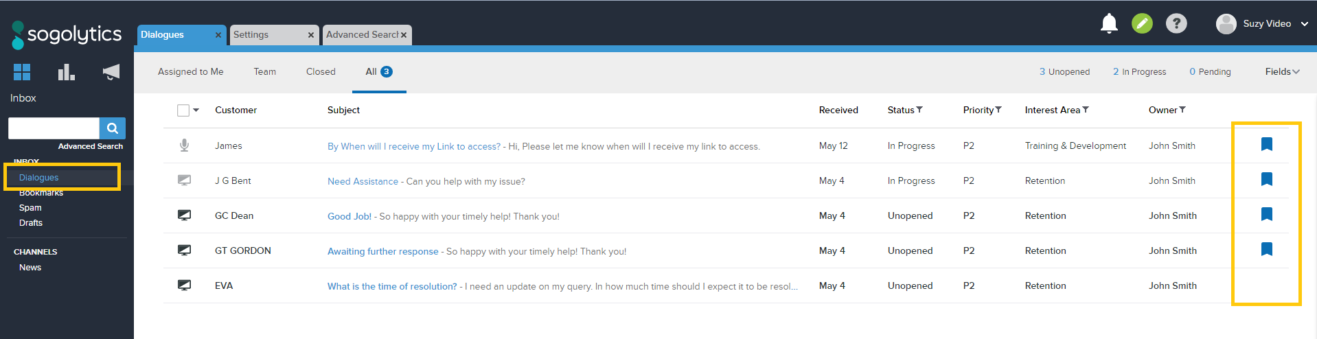 If you’re on any Dialogue page, look over at the left-hand column and under the “Inbox” section, you’ll see a “Bookmark” option. Click on “Bookmark” and a new tab will be opened where all of your bookmarked Dialogues will be located.