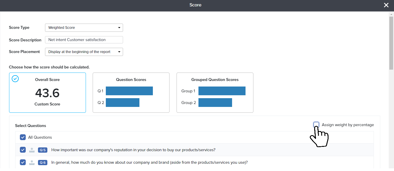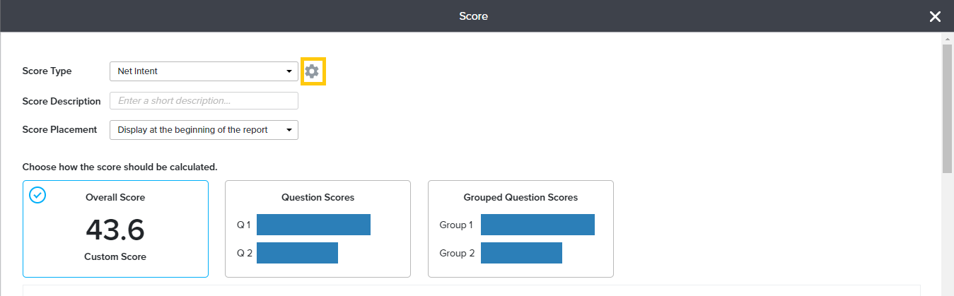 - If you choose Net Intent or Percent Favorable, you may choose to customize the score calculation by clicking on the customize icon beside the dropdown.