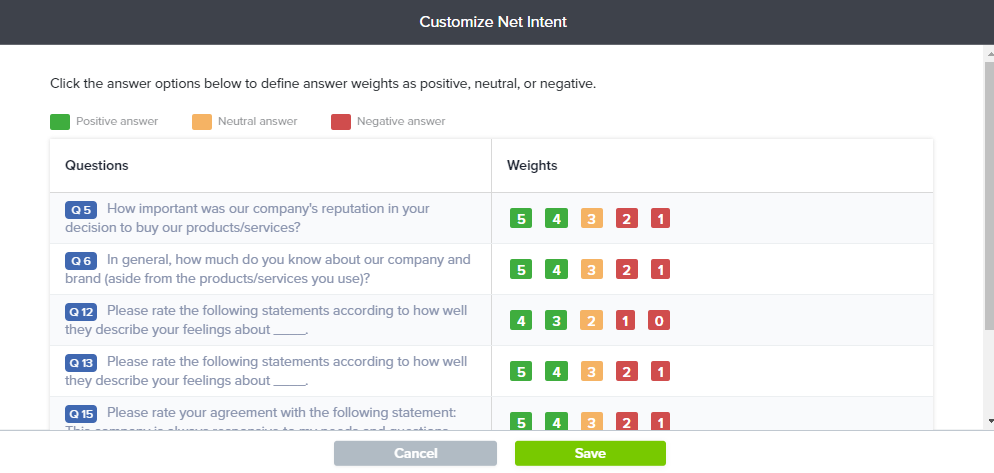 If you choose to customize the Net Intent, all rating questions will be displayed with scale answer options categorized as Positive, Neutral, and Negative. Note that only positive and negative weights are considered while calculating Net Intent. Neutral weights are discarded in the calculation. Click each answer to change the default classification assigned. When you are finished, click Save to apply the changes and close the modal.