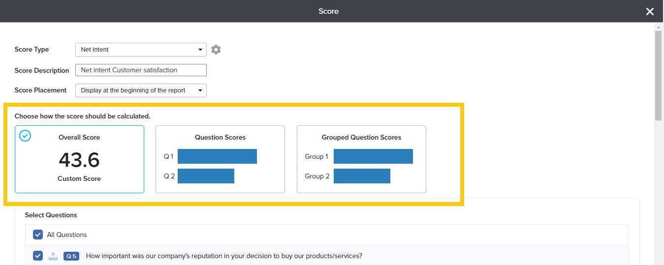 - Select the score type you want to display. Provide a description for the Score and select its position in the report. By default, the Score will be placed at the beginning of the report, but you can change this from the dropdown menu.