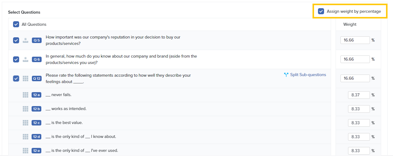 - By default, weights are split evenly across all selected questions, as well as across sub-questions. Make any required changes to weights here.