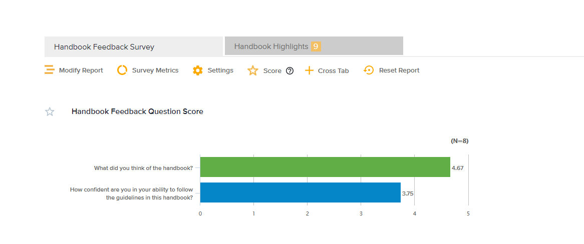 If your survey contains two 10-point scale rating questions, and one 5-point scale rating question, Score will extrapolate the data for the 5-point scale question to a 10-point scale. In this example, a rating of 3 on the 5-point scale will be shown as a rating of 6 on the 10-point scale.