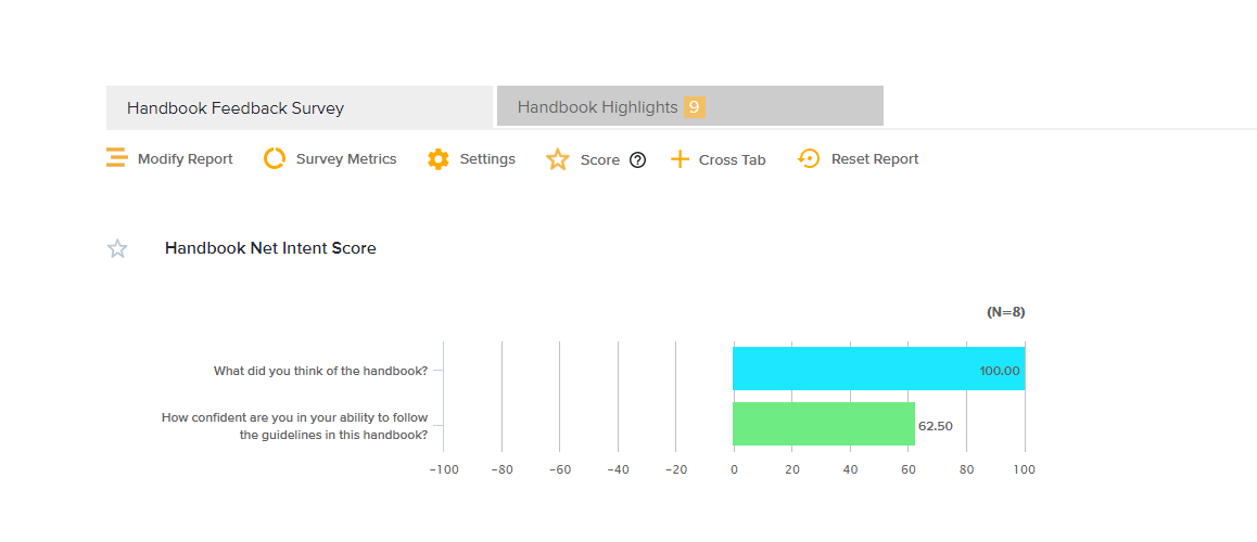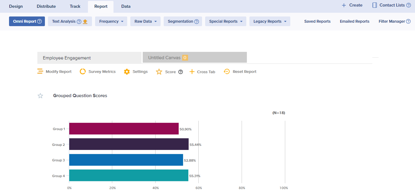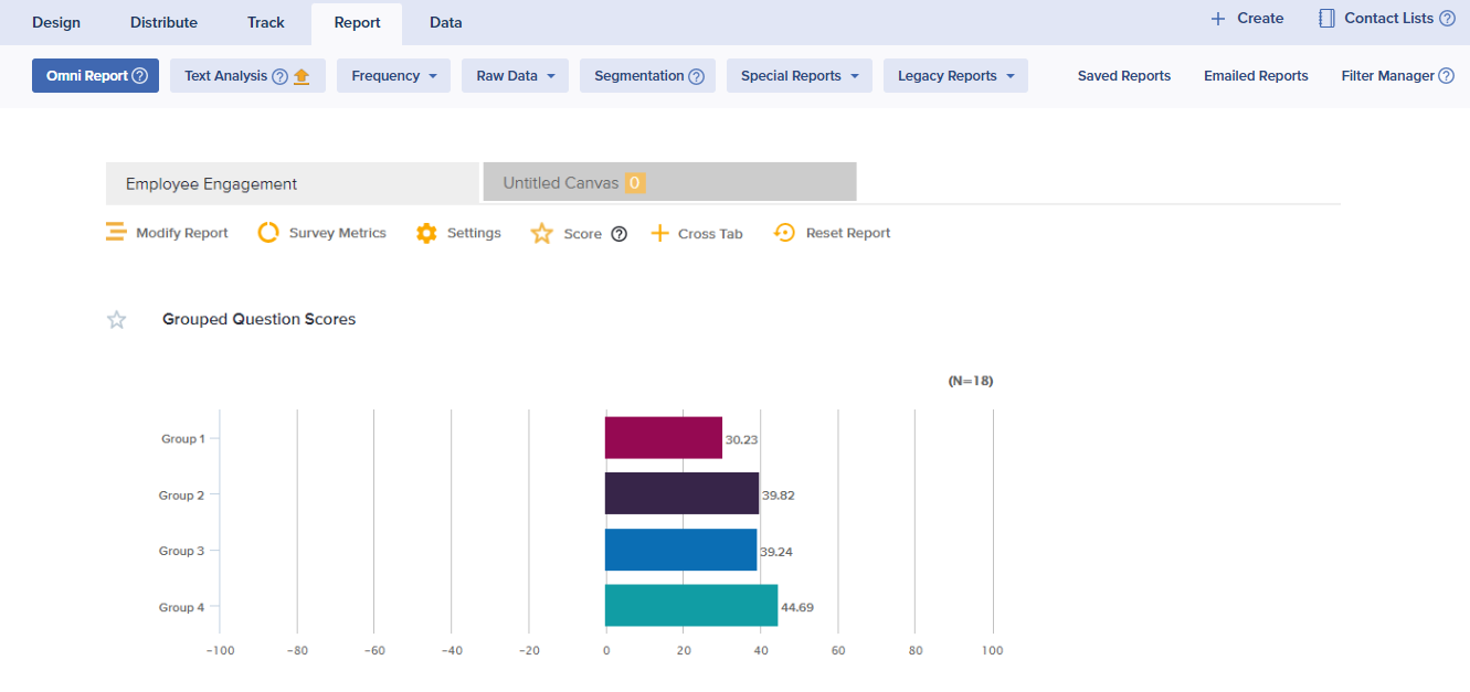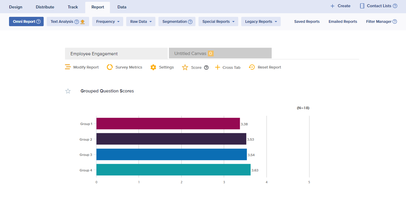 Grouped Question Scores: This option displays the Weighted Score/Net Intent/Percent Favorable of various question groups in a single graph.