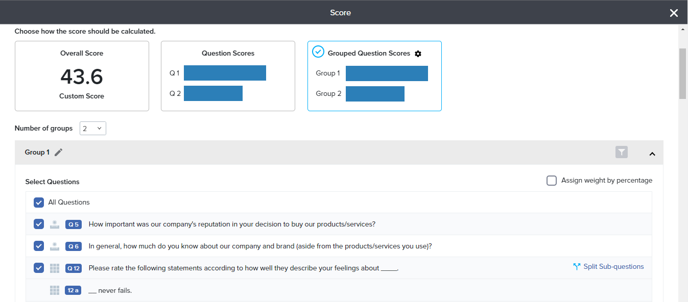 - By default, all sub-questions within a Grid are considered to be part of the same question. To consider each Grid sub-question as a standalone question within Question Scores, use Split Sub-questions.