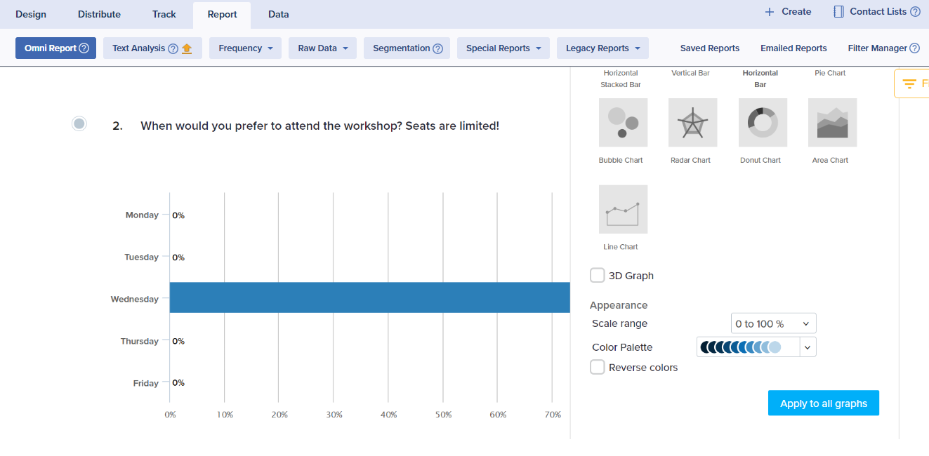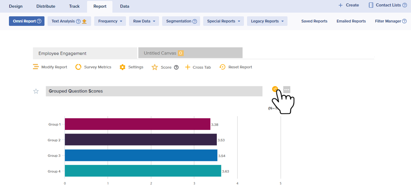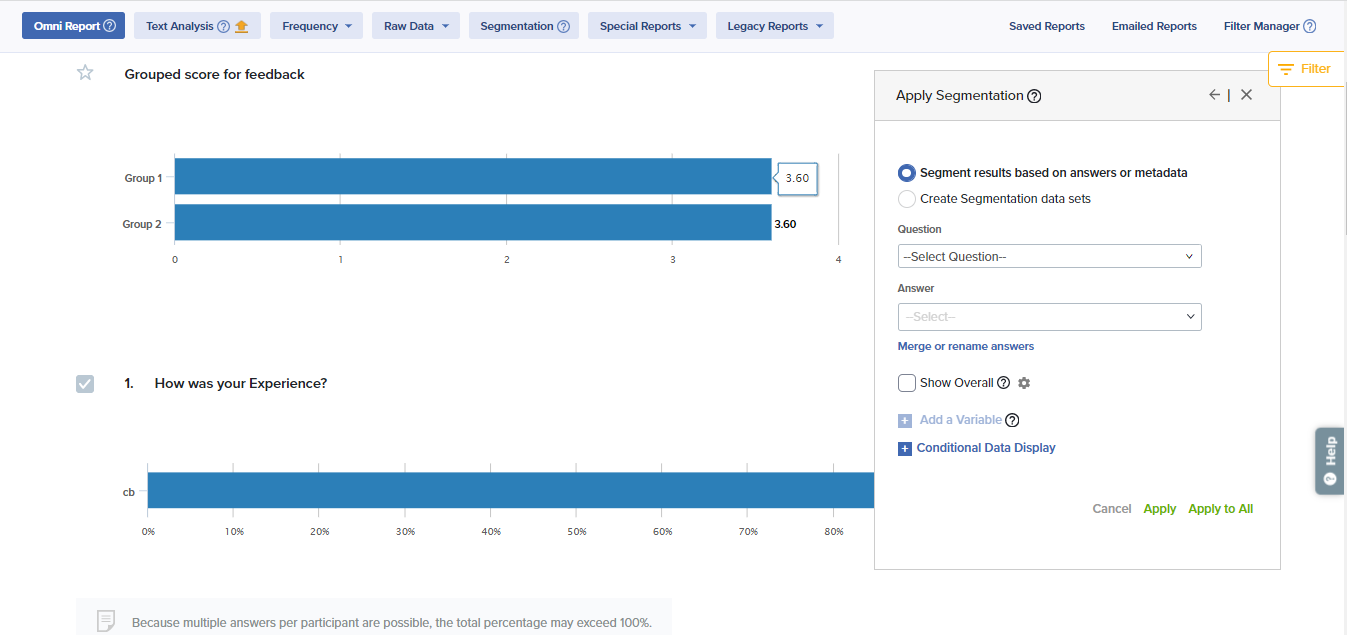 - Apply Segmentation: To drill down to a deeper understanding of your results, you can apply segmentation based on the question and answers of your choice or create data sets to compare. Learn More.