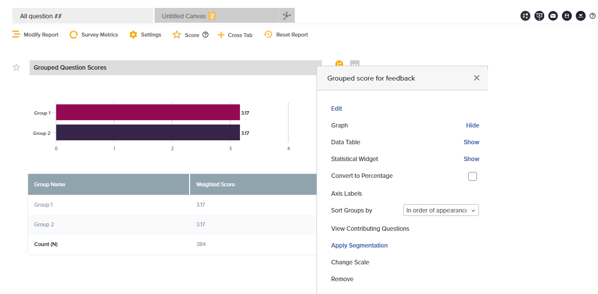 - When segmentation is applied to the Question Scores or Grouped Question Scores, ‘Highest to Lowest’ and ‘Lowest to Highest’ are not available.