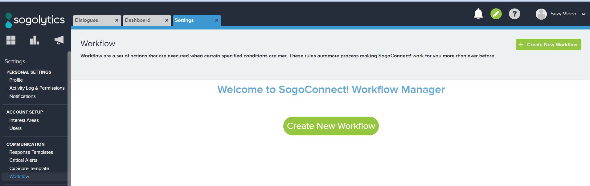 Make SogoConnect work for you like never before. System Administrators can create automatic workflows that will help build efficiency, improve performance outcomes, and enhance data. A workflow is a set of actions that are executed when specified conditions are met. Use workflows to automate processes like escalating past due Dialogues to a manager, simplifying support processes, or following up on low CX scores.