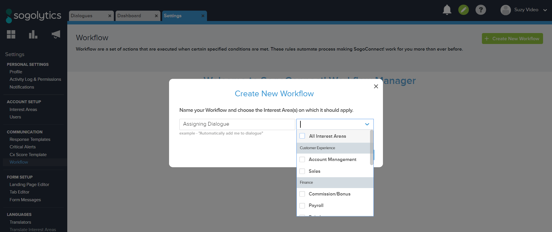 - To get started, name your workflow and select which Interest Area(s) it should apply to. For example, a workflow can be titled “Escalate Past Due Dialogues” and applied to all Interest Areas.