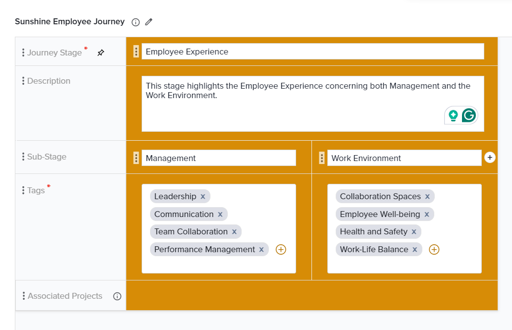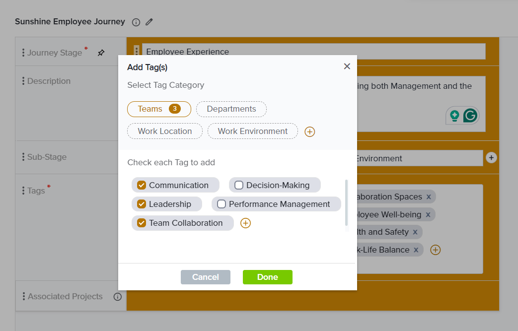 4. Click on the Tags section for every sub-stage to assign Tags. Tags are required to indicate the touchpoints, departments, teams or other custom business elements involved at each Stage/Sub-stage.