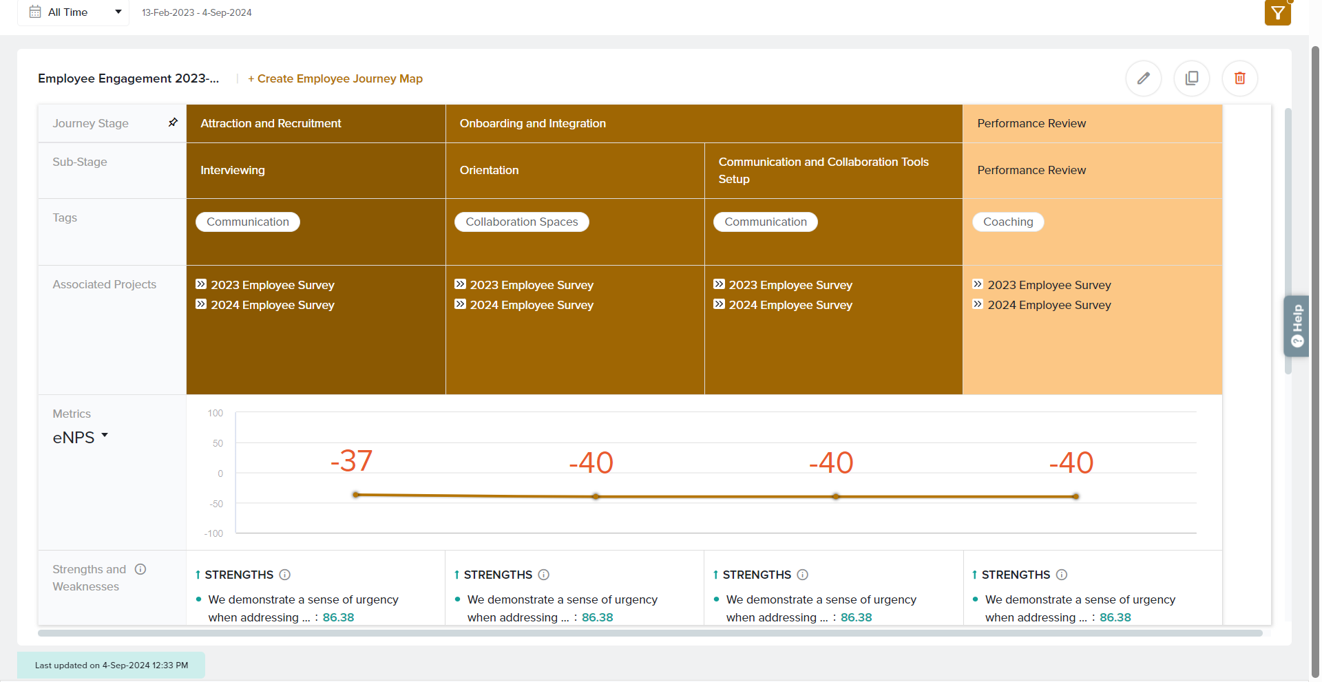 11. As responses are collected, metric data associated with your identified Tags will begin to populate your Employee Journey. Tagged Drivers in your projects are also analyzed and segregated into Strengths and Weaknesses.