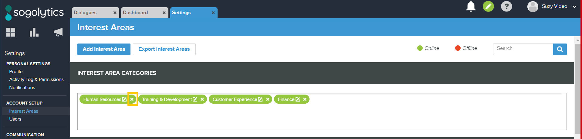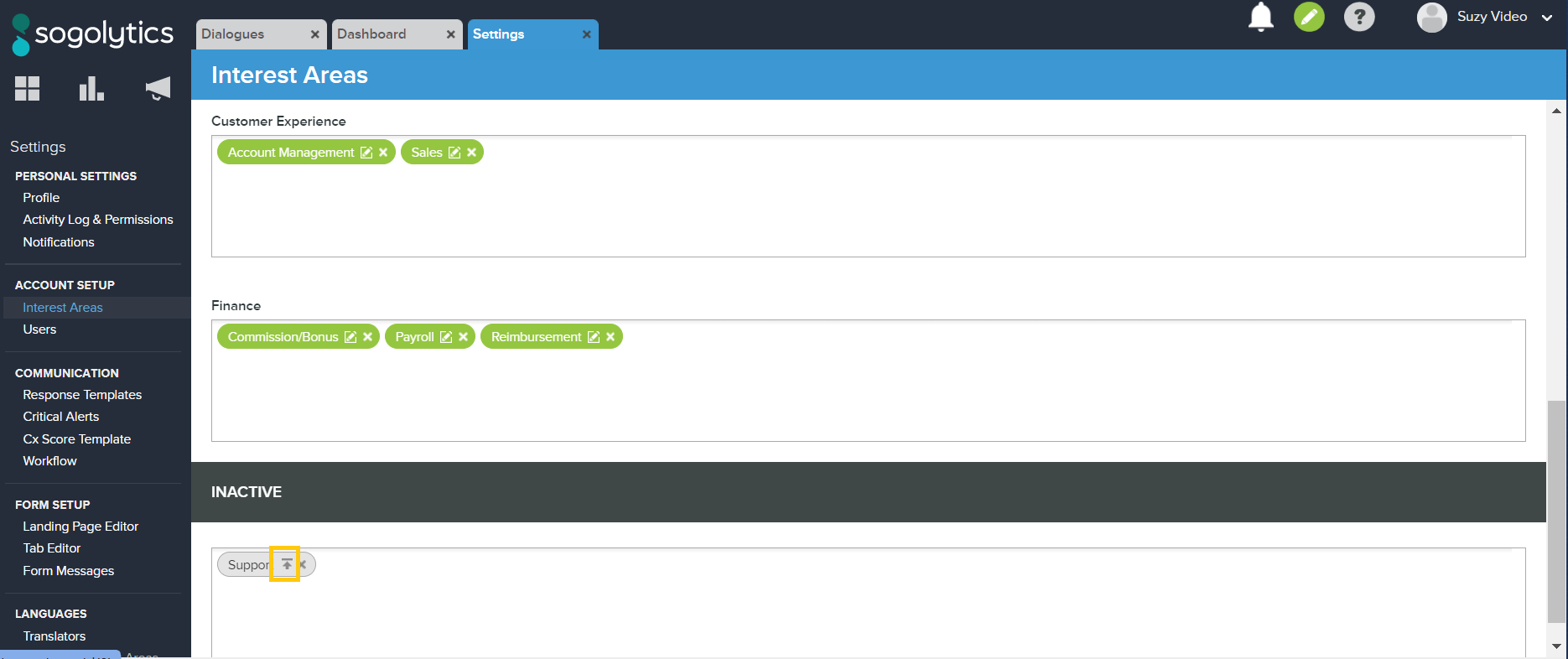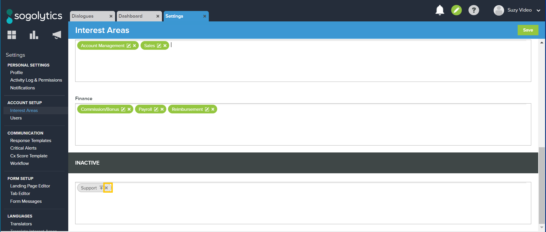 Delete: Within the Inactive box, click the X icon to the right of the Interest Area name or Category. This will permanently delete this Interest Area or Category. You cannot delete an Interest Area if it has existing Dialogues associated to it. To delete an Interest Areas with Dialogues assigned to it, you will need to reassign the Dialogues to another Interest Area.
