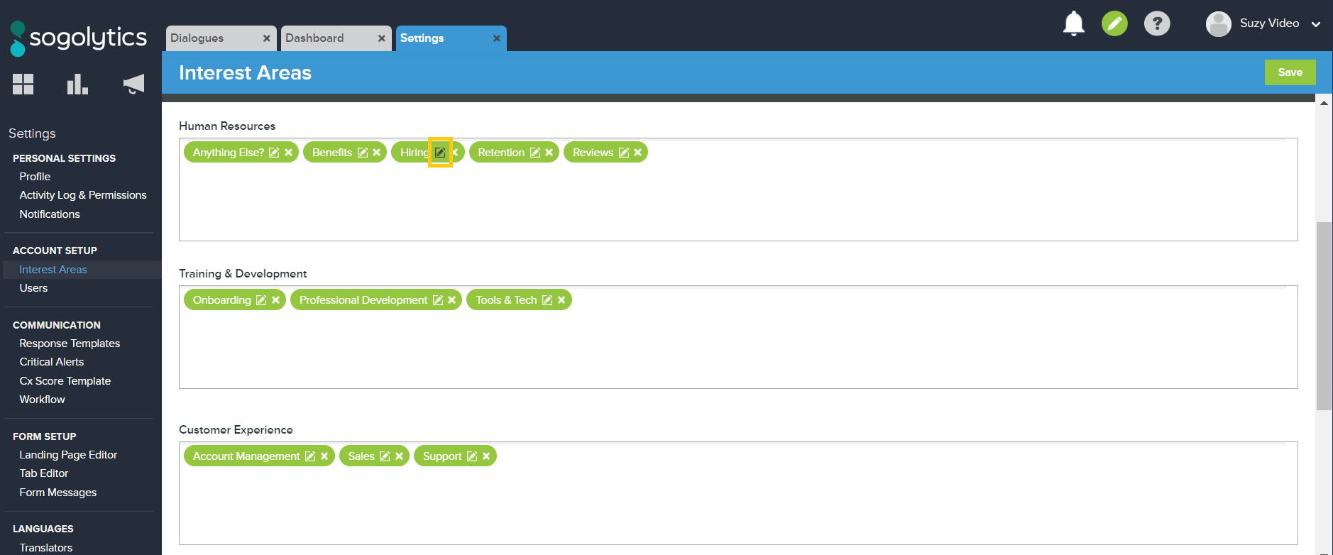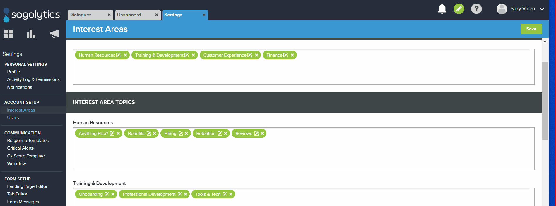 Once you have edited your Interest Area and Categories, click the green Save button found in the top-right hand corner of the page.
