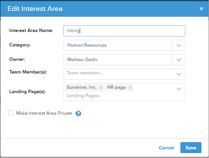 Edit: Click the Edit icon to the right of the Interest Area name to edit the Interest Area Category, team owner, team members, or Landing Page(s) where the Interest Area is published.