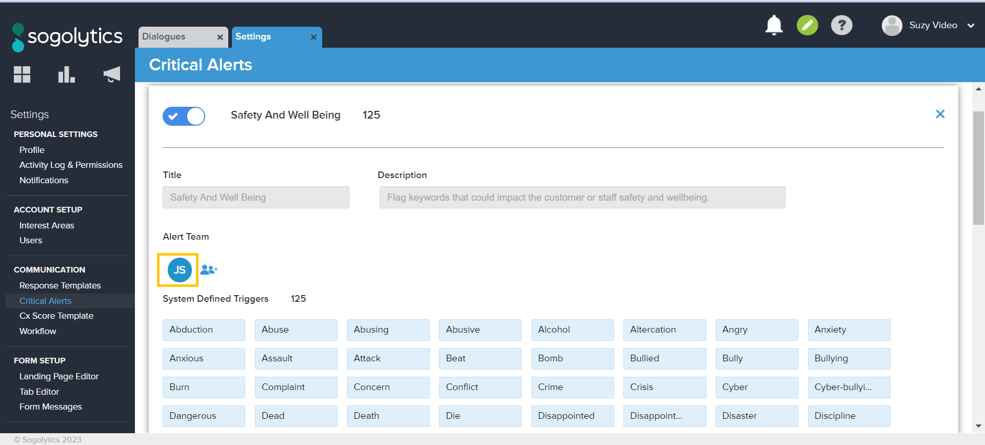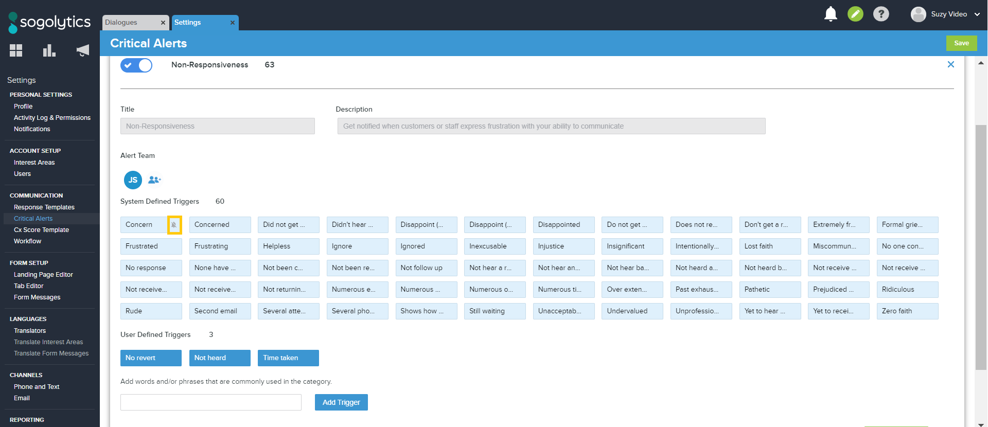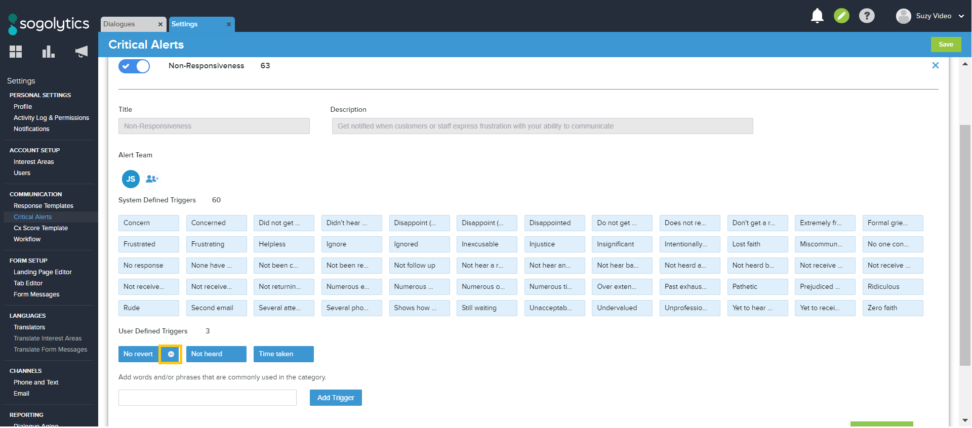 When automatic Critical Alerts are enabled, SogoConnect will scan existing and incoming Dialogues for trigger words and phrases, based on a combination of system and user-defined keywords. Dialogues matching these Critical Alert keywords and phrases will be marked as Critical. The customizable list of keywords allows you to pinpoint hot topics in your organization, bringing Dialogues about hot-button topics to your attention instantly.