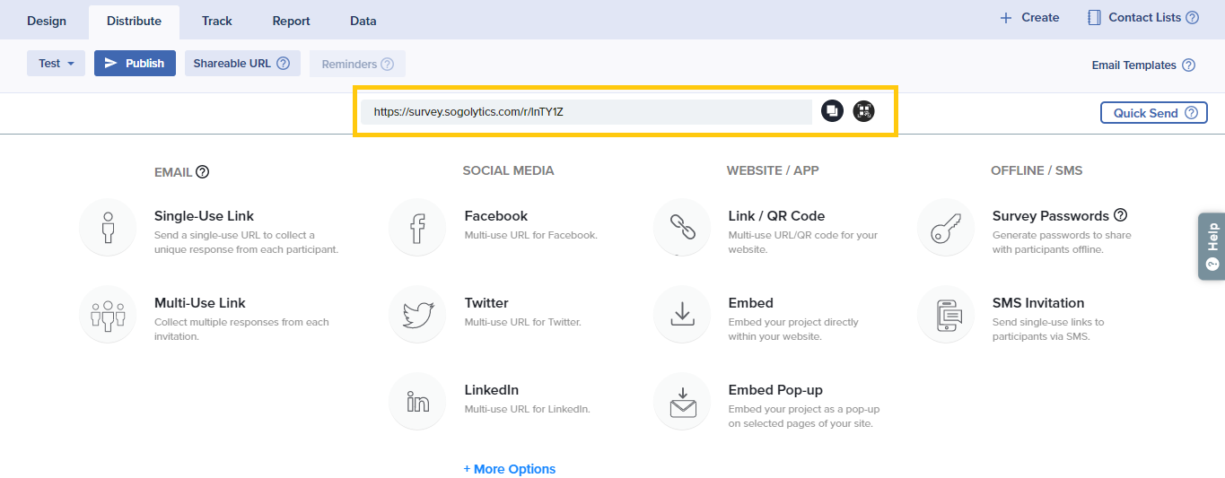 Generating a Shareable URL is one of the most common ways to share a survey. This link can be easily published to a website or blog. Also, when you are using a third-party system to distribute, this link is a great option. Plus, if you would like to place a link in multiple locations, you can create and label different links to the same project. Or, download a QR code for any Shareable URL to make participation easy. When your project is finished, you will know how your participants found you!