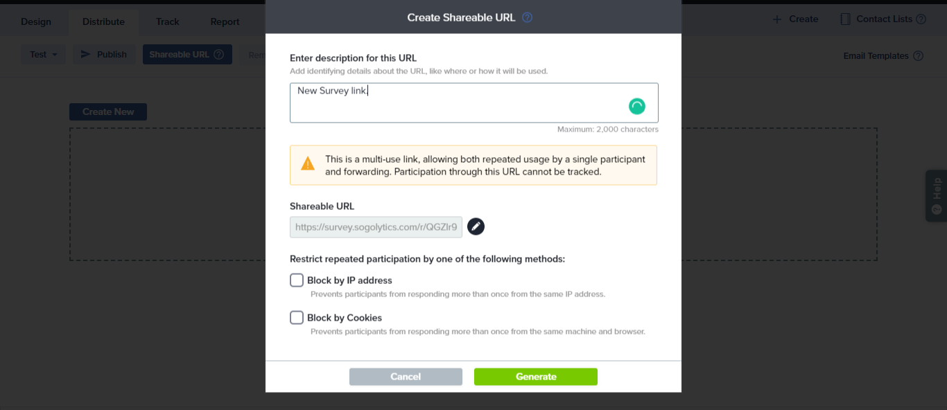Apply restrictions while creating your URL or by selecting your URL and clicking on Restriction Settings. Choose your preferred restriction method from the list of available options.- Block by IP address: Prevents participants from completing the survey multiple times on the same network. Best used when there is no reason that participants would have the same IP address. This option should not be used if participants are taking the survey from the same physical location.