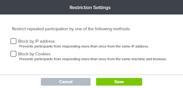 - Block by Cookies: Prevents users from taking the survey multiple times on the same browser. This is best used when participants will be taking the survey from different computers.