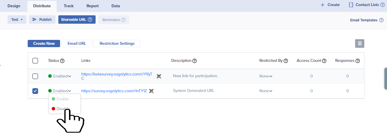 If you need to expire the link and stop participation through one or more URLs, select the URL(s) and click on the Status dropdown menu and click Disable. Any participant who accesses an expired link will see a message that the survey is unavailable. - Download QR code