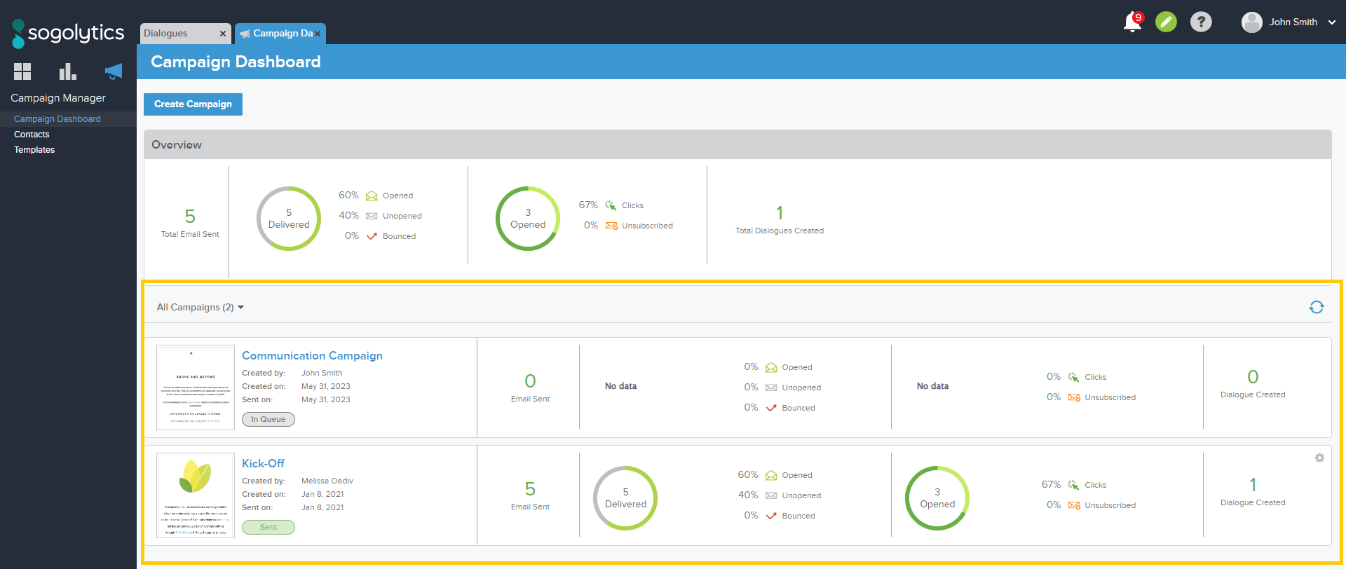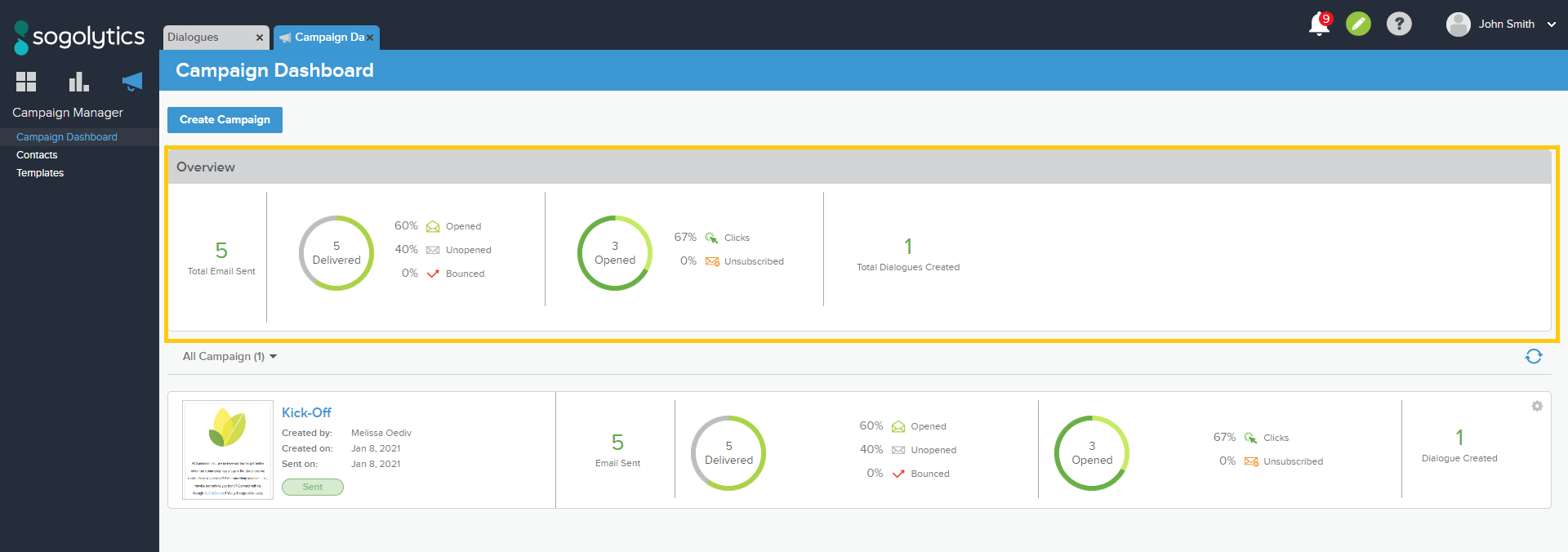 Click Campaign Dashboard, then scroll down to see Overview, followed by each campaign and its relevant statistics.