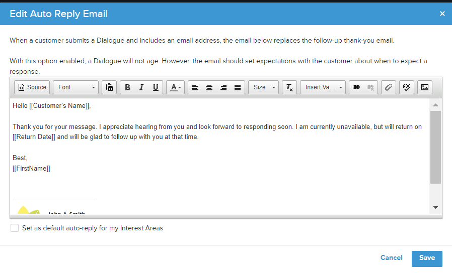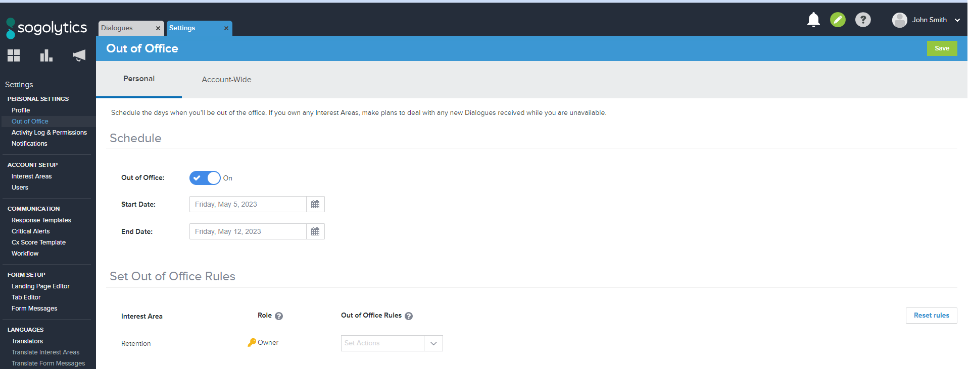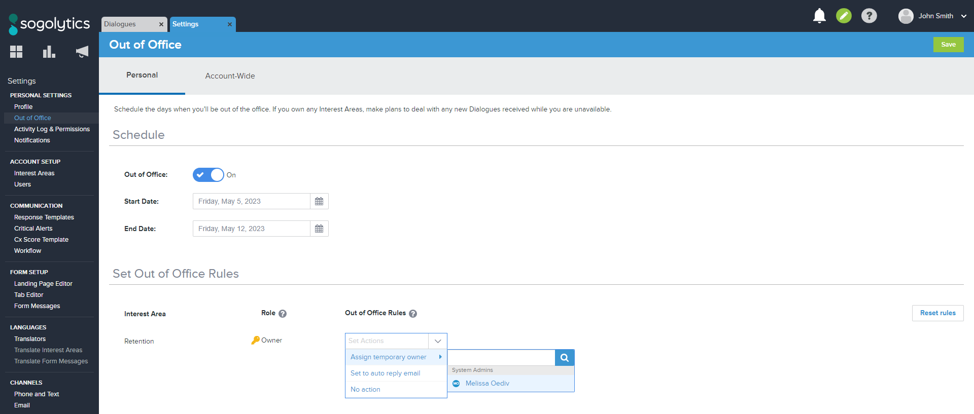 The User: If you’ll be unavailable for a period of time and are a Team Owner of any Interest Areas, you should definitely set up your Out of Office status. This way, customers who submit a Dialogue into your Interest Area will either have an active user responding to their message or a clear understanding as to why they will receive a response later than expected. Within the platform, your Username will also appear with an Out of Office label, so that other users know not to assign Dialogues to you while you are unavailable.