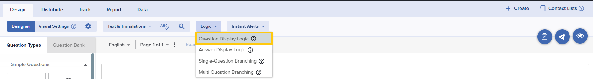 Question Display Logic is a type of skip logic that hides a certain question on a page unless the participant responds in a particular way to an earlier question. This feature allows you to ask questions to only those participants for whom the questions would be relevant.
