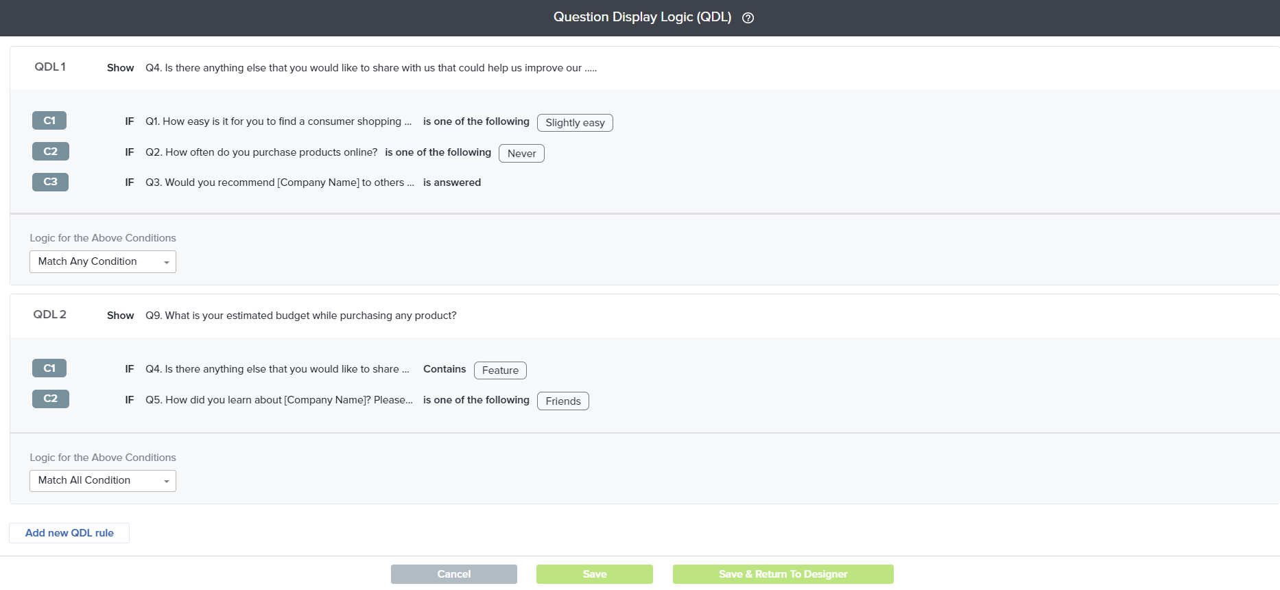 You can add up to 10 conditions within a single QDL rule. You can set up to 20 QDL rules on a page and up to 200 in a survey. Please note that limits vary by account type. Click here to learn more.