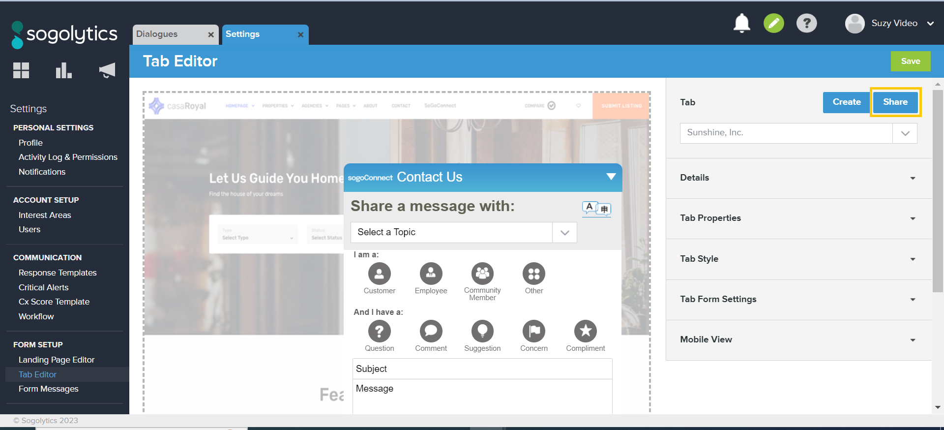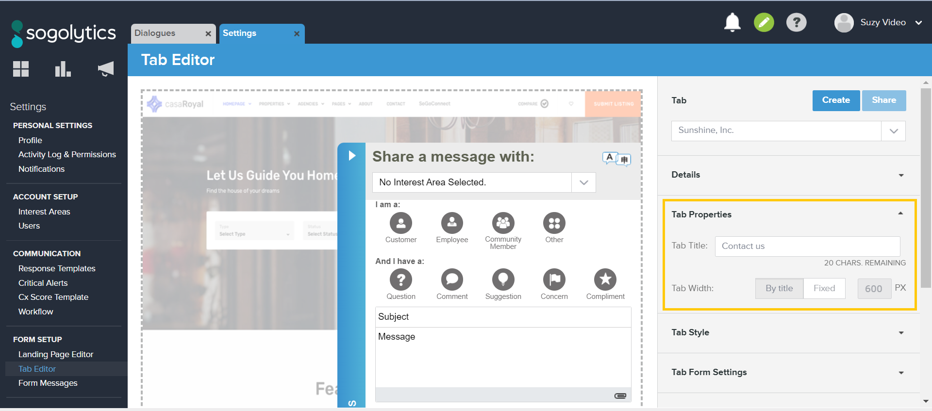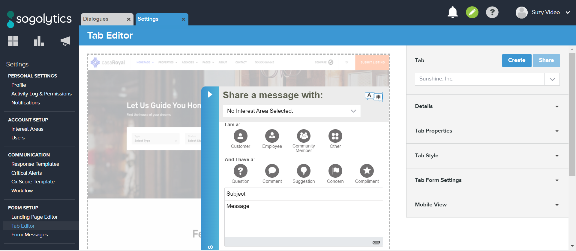 - Under Tab Form Settings, add the message you would like Customers to see at the top of the opened Tab. This message appears above the Interest Area dropdown menu.