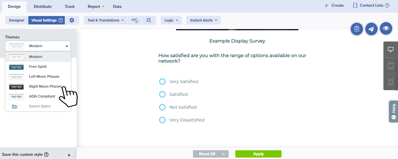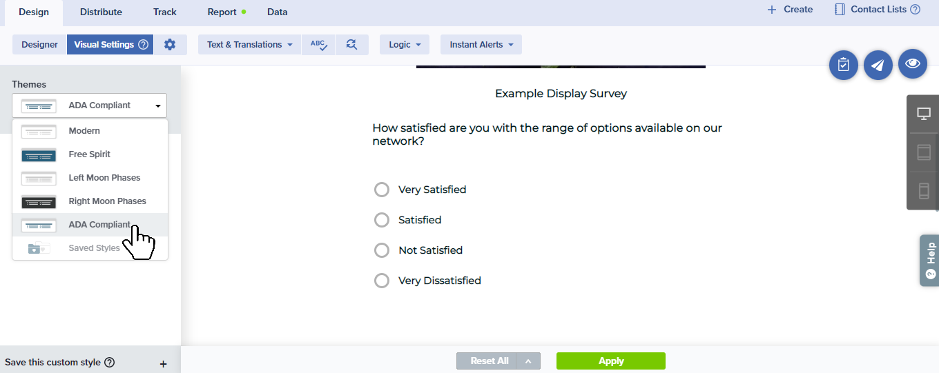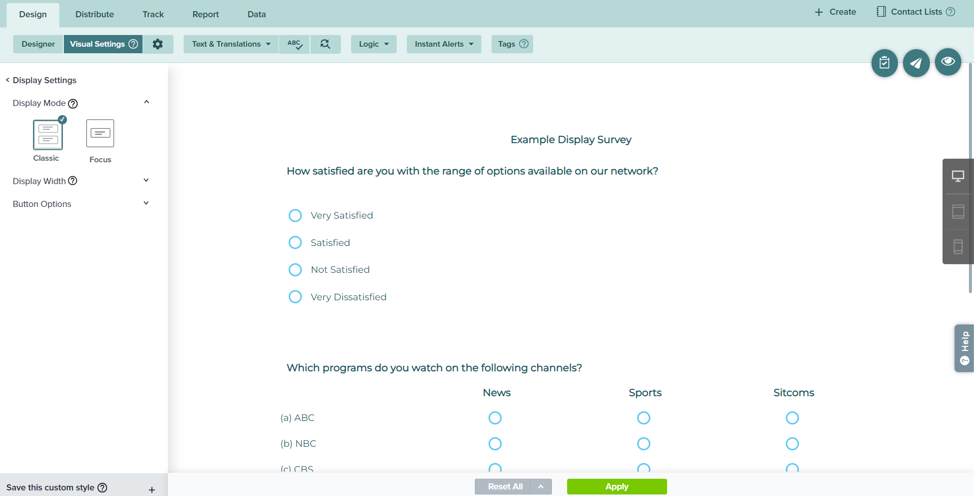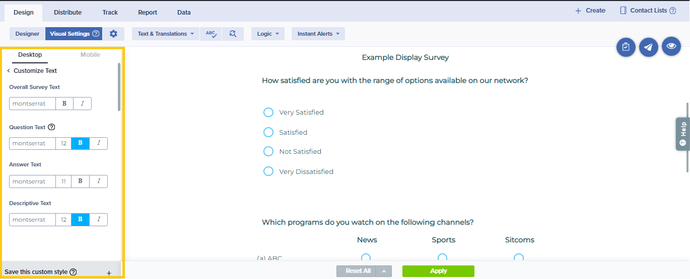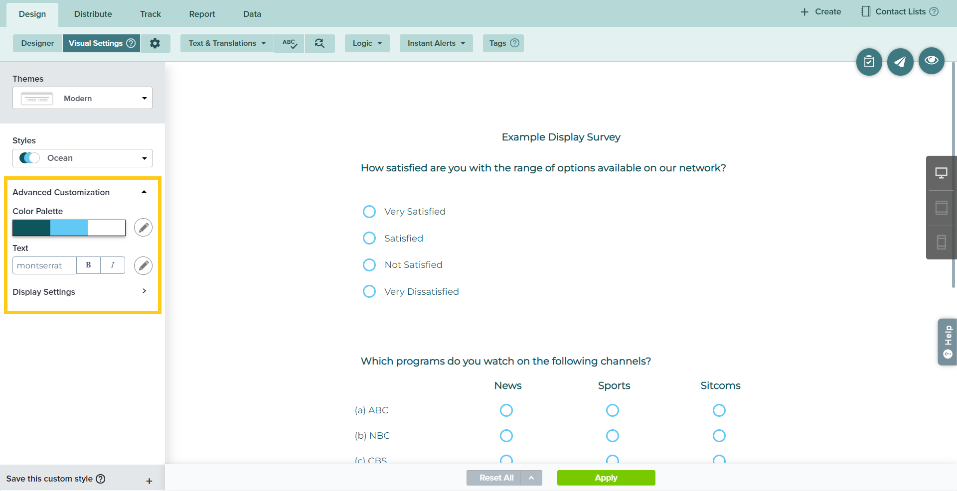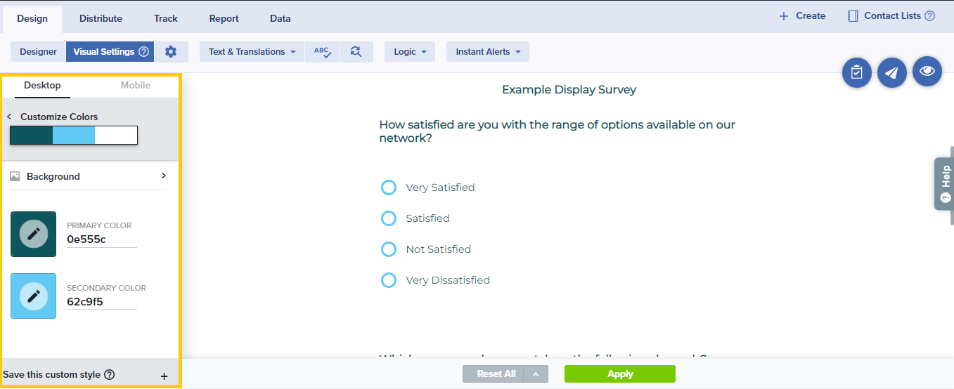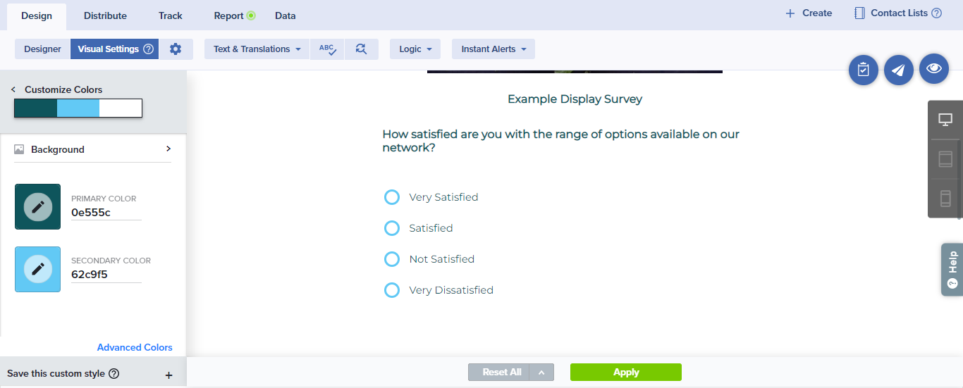While content is very important, options in the Visual Settings section provide many ways to make your project look great, too. Sogolytics allows you full control over colors, fonts, background, and display width.