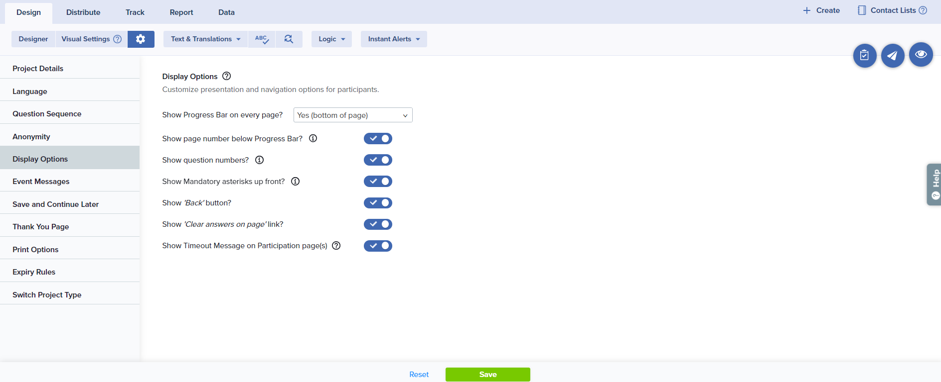 • Clear Answers: When enabled, this button will be shown on the participation page and will allow participants to clear all answers on the page at once.