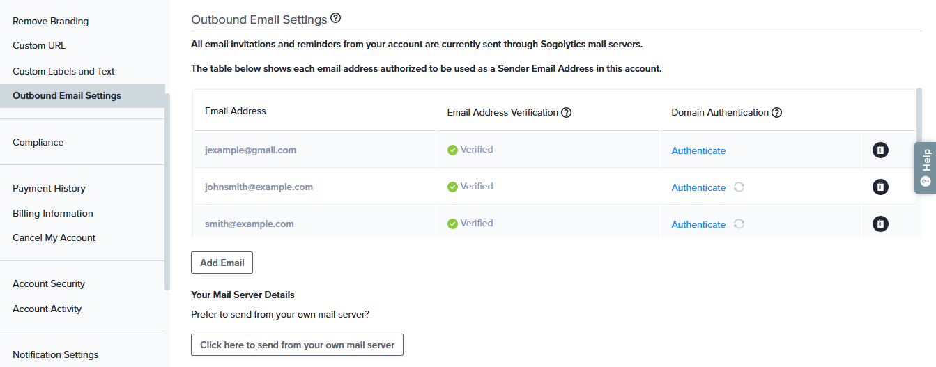 This section is applicable only if you are using Sogolytics’s mail servers to send emails and not your own mail server. All email addresses you intend to use as Sender Email Address in Sogolytics must be verified first.