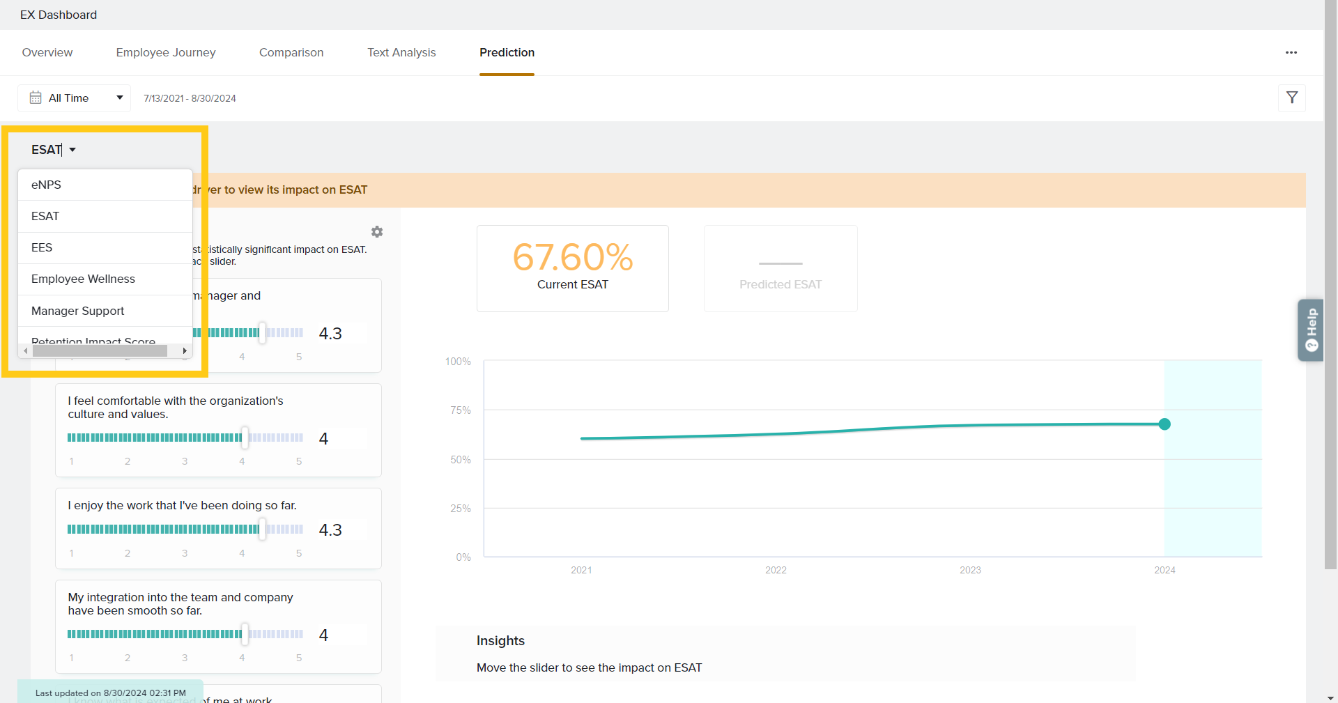 Want to know where to invest your time and resources? Metric prediction allows to study how the variables represented by your EX driver questions impact the metric score. The interactive simulation allows you to increase or decrease EX driver ratings, calculates the impact, and plots the predicted metric score. Examining these results can help you to make decisions about which changes can have the biggest impact on improving your employees’ experience.