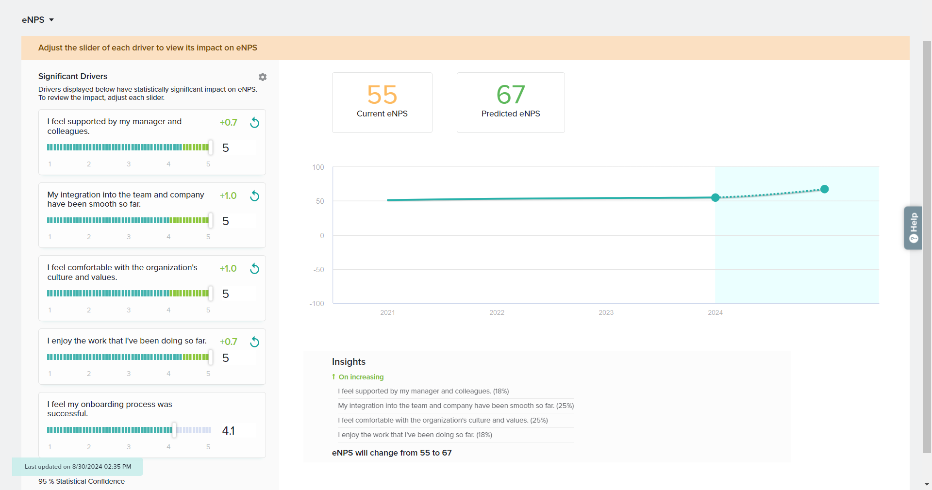 - Simulate an increase or decrease in driver ratings by moving the sliders for different Significant Drivers. As you move driver ratings on the left, the predicted metric score will be plotted on the right.