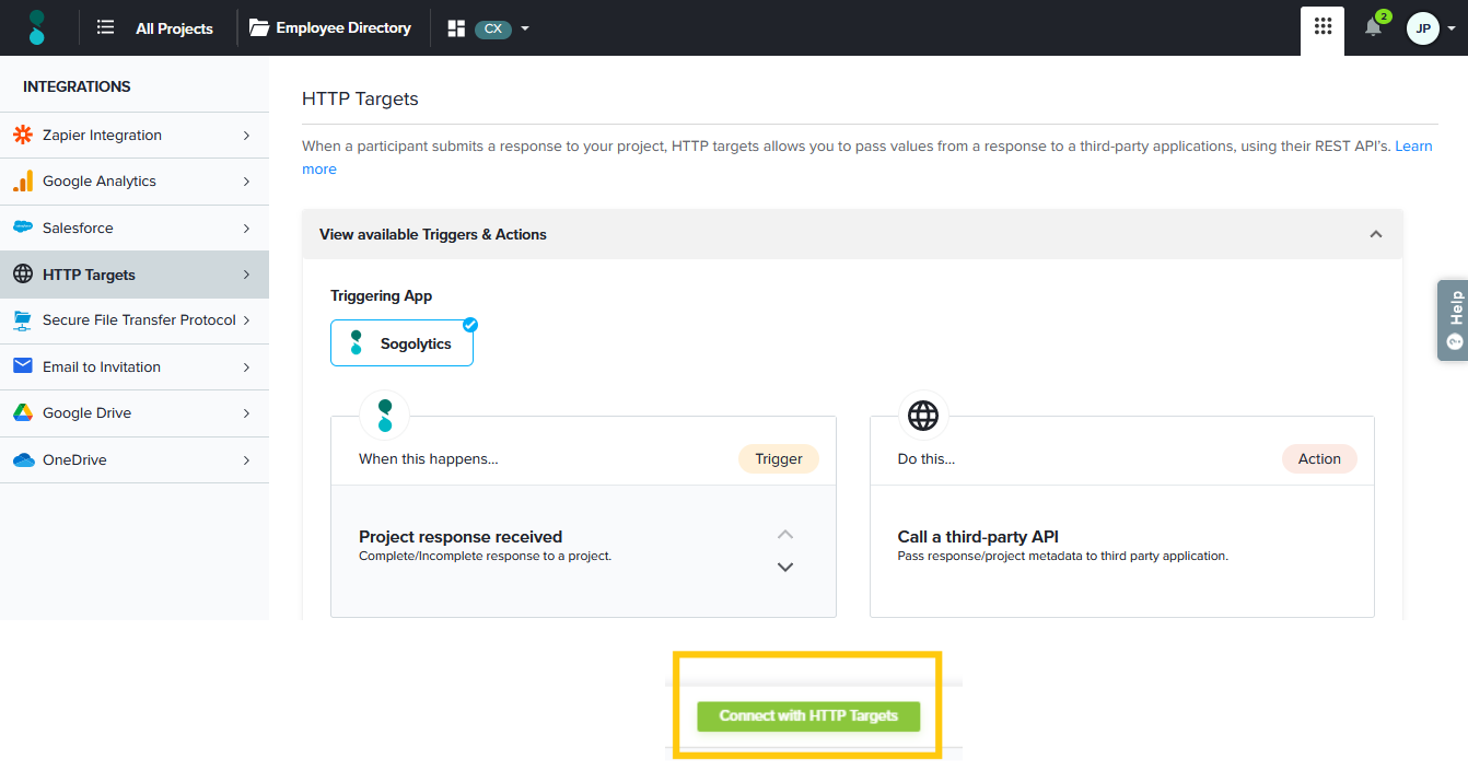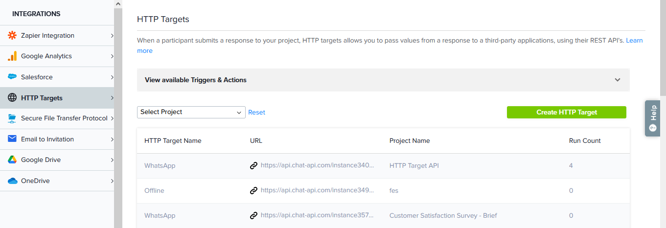 When a participant submits a response to your project, HTTP Targets allow you to pass values from a response to a third-party application, using their REST APIs.