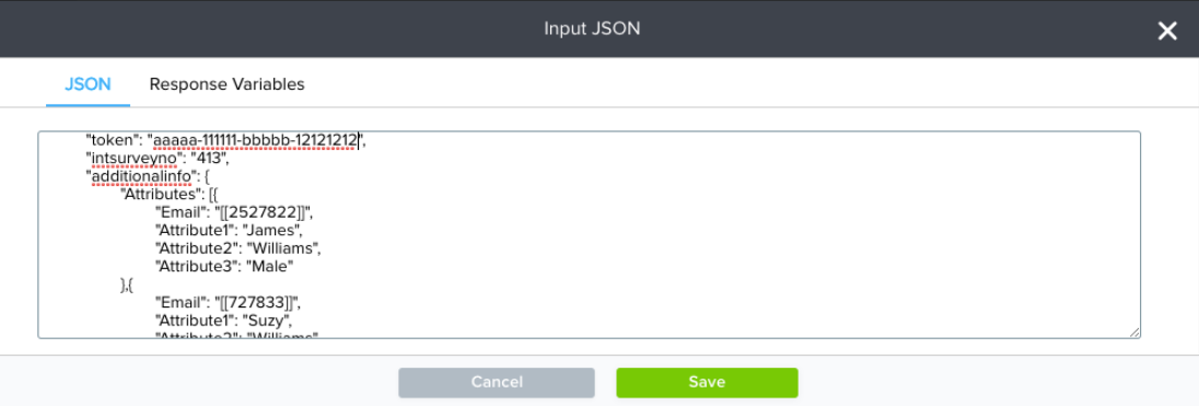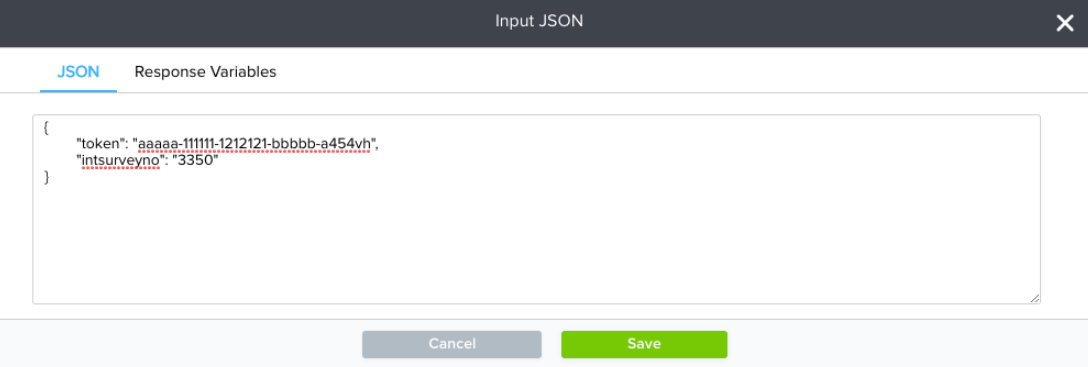 - Based on your Content type selection, click on Input JSON/XML tab. You will have an option to enter the JSON/XML. In the Response Variables tab you may copy and replace response variables in the JSON/XML.