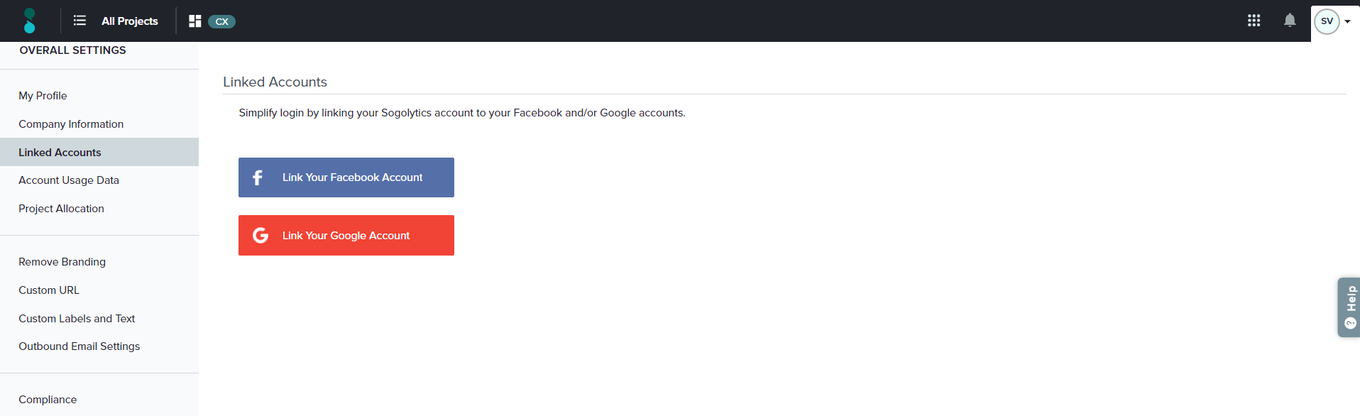 It is possible to link your Facebook and Google accounts with your Sogolytics account. This enables you to log in to your Sogolytics account using the linked Google and/or Facebook accounts. Follow the steps to connect and then log in to your survey account.