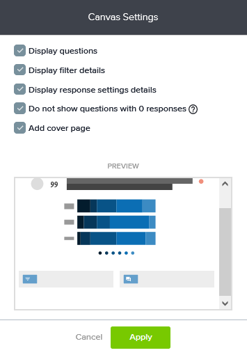 - Display filter details: Check/uncheck to show/hide any details about any filters applied to specific questions or the overall report