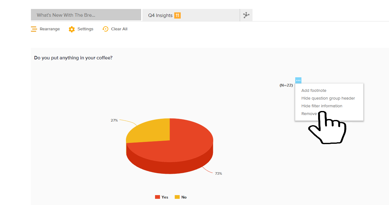 - To hide a question group header, hover over a related graph or table, click on the three-dot menu, and click ‘Hide question group header’. Display it again by returning to the same menu and clicking ‘Show question group header’.