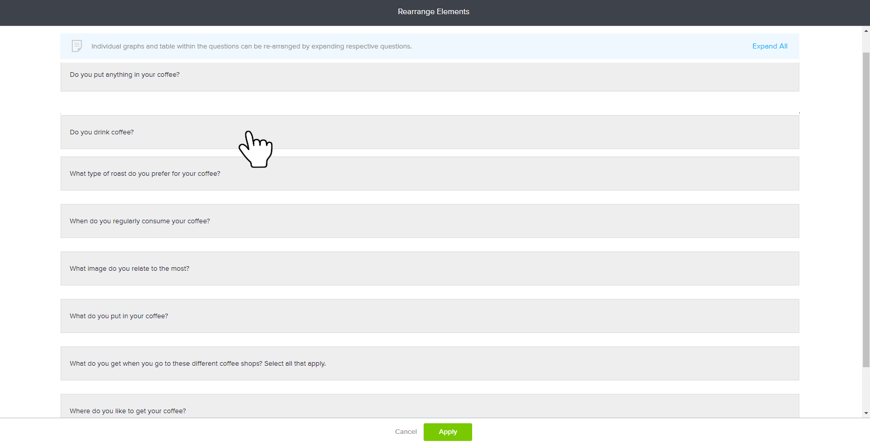 - To rearrange the graphs and data tables of individual questions, click Expand All in the top right. All graphs and tables of all questions added to the canvas will be displayed.