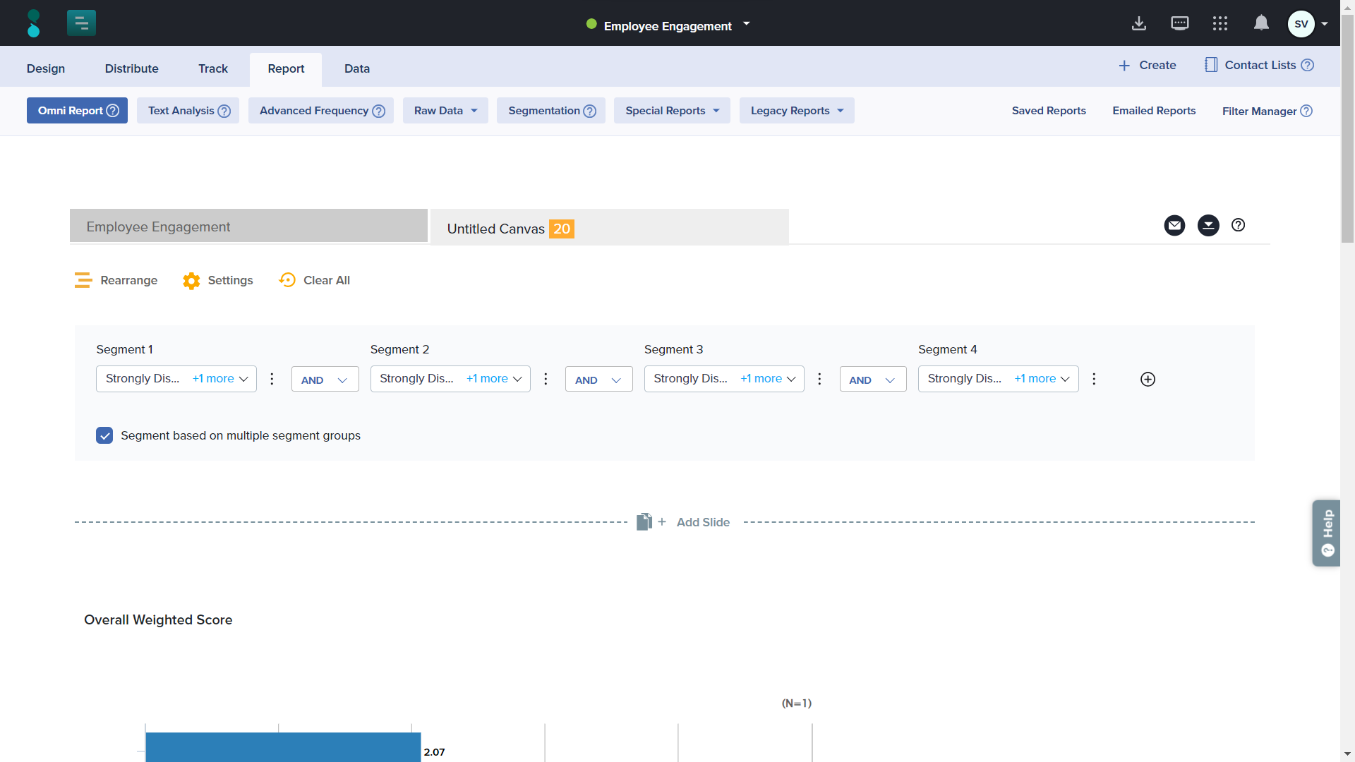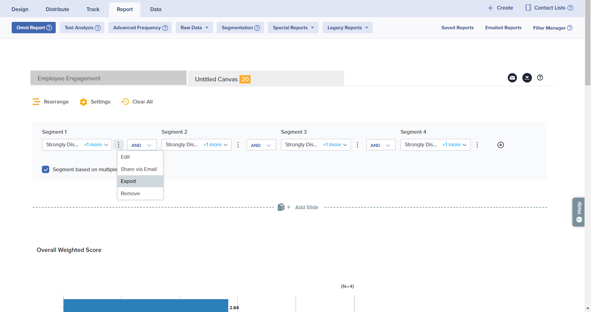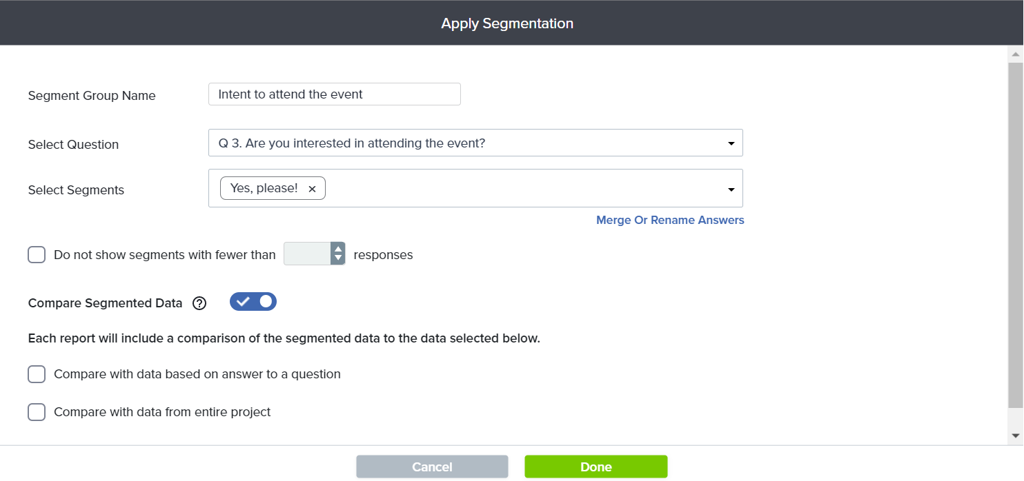 - After a segment question is added, a dropdown will be displayed at the top of the report. When you select segments, the report below will update accordingly.