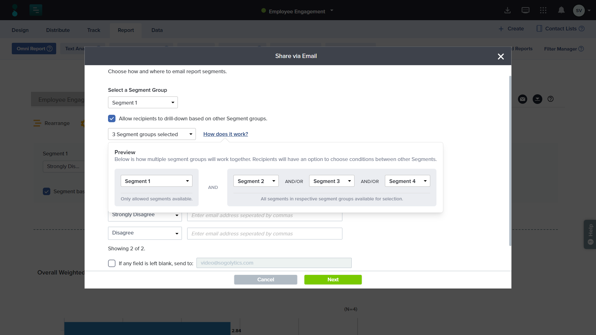 - This feature also allows you to send each segment separately to different email addresses or map and send each segment’s data to email addresses on a Contact List. To protect participant confidentiality, you may choose not to share segments with only a few responses. When this option is chosen, the platform will only share segments that match your criteria.